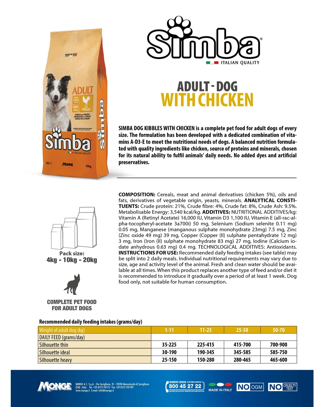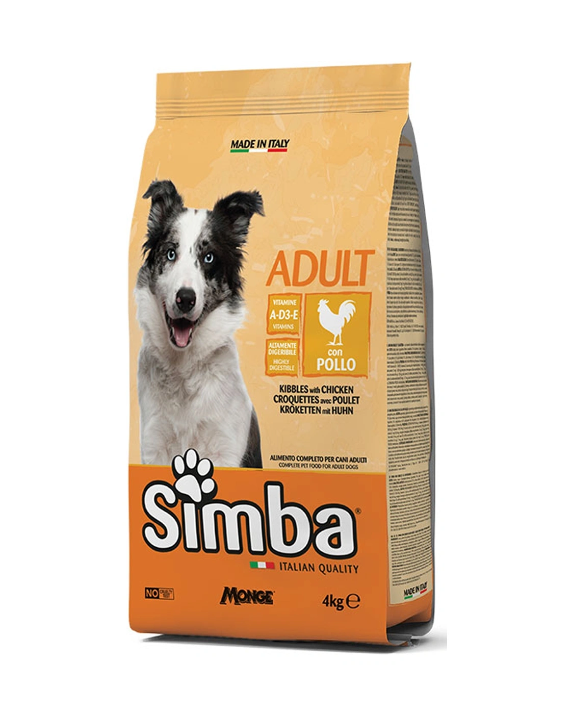 Simba Adult Dog Kibbles with Chicken is a complete pet food for adult dogs of every size. The formulation has been developed with a dedicated combination of vitamins A, D3, and E to meet the nutritional needs of dogs. Balanced nutrition is crafted with quality ingredients like chicken – a natural source of proteins and minerals – chosen for its ability to fulfil animals’ daily requirements. No added dyes or artificial preservatives.