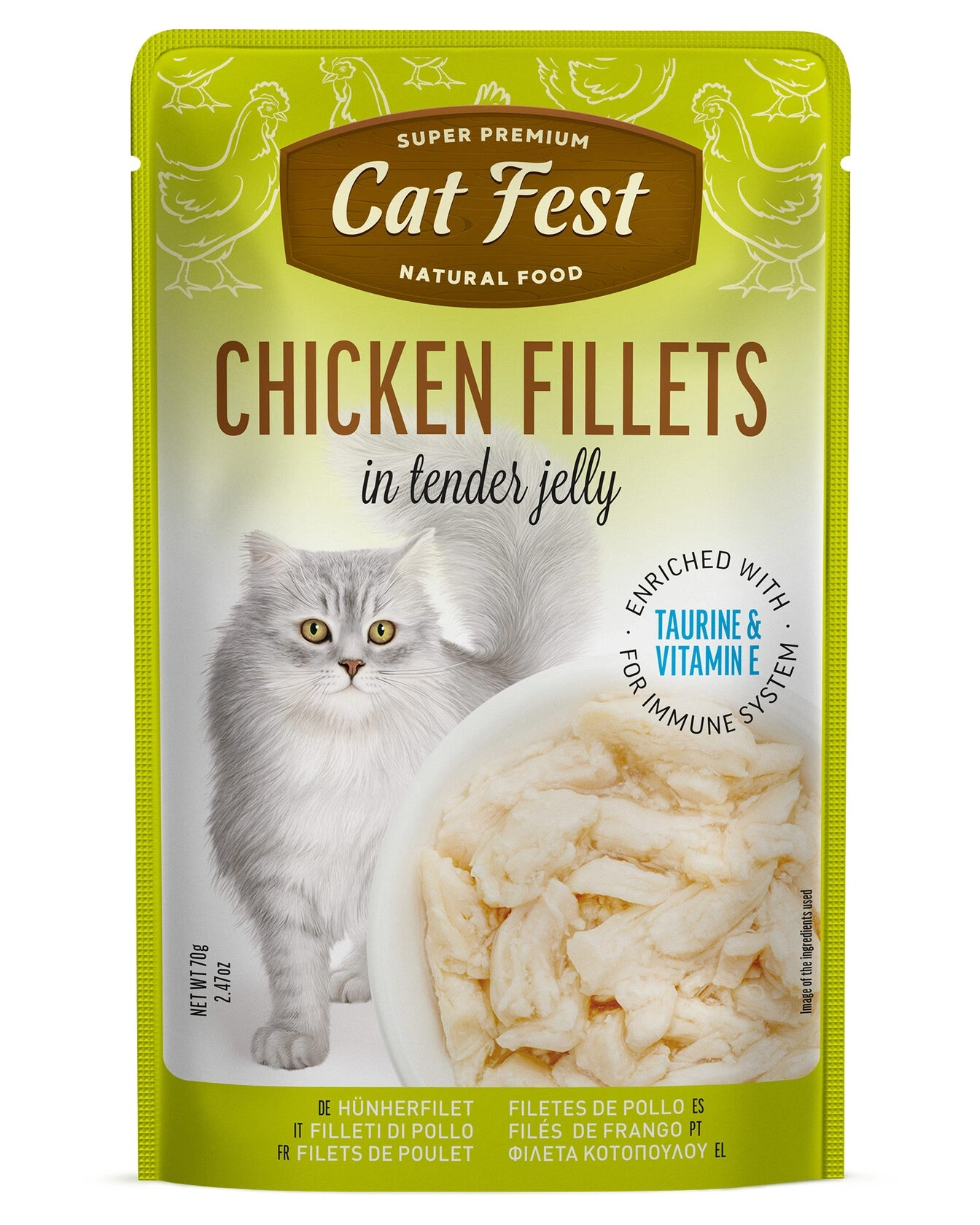 A complete meal of juicy steamed chicken pieces covered in natural jelly — it’s what every cat loves without exception. This food will delight your pet and give them the energy for new achievements.