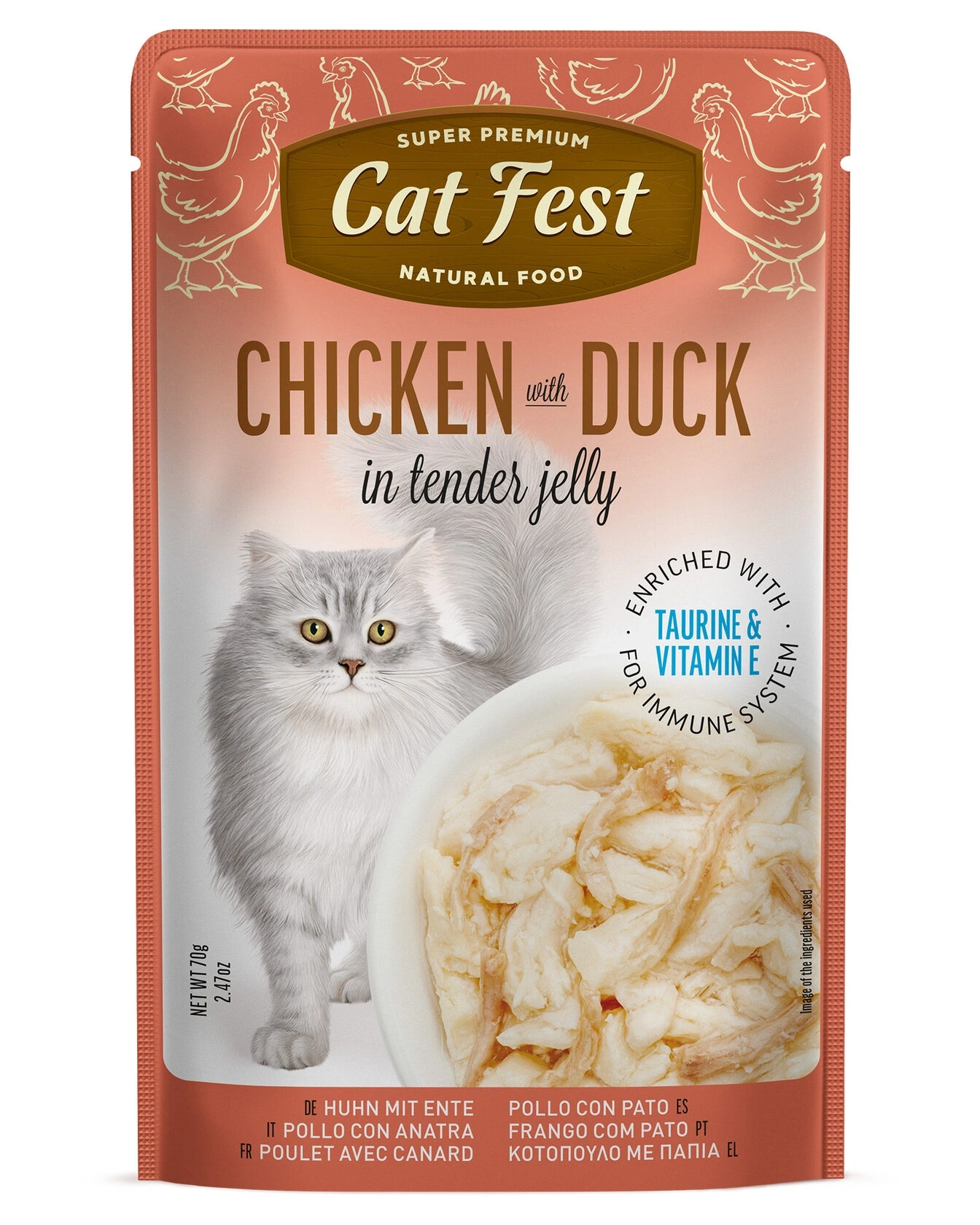 A meal of select chicken and duck fillets, steamed to perfection, is our offering for the most discerning gourmets. Your pet simply won’t be able to resist the combination of tender chicken and flawlessly cooked duck, each piece elegantly coated in delicate jelly.
