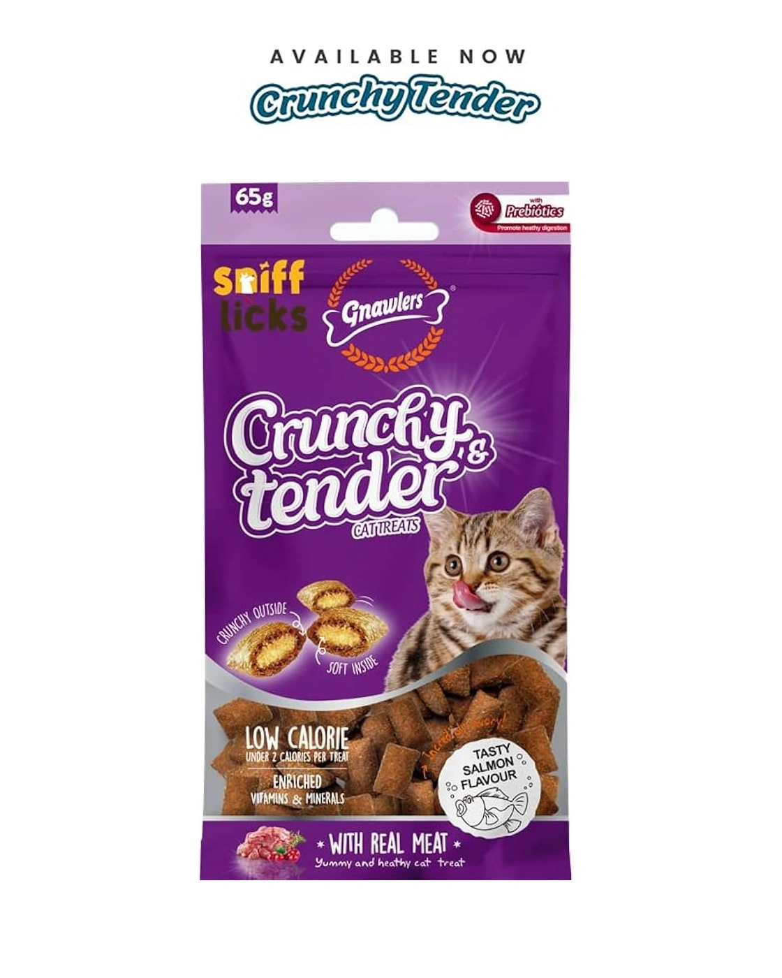 Gnawlers Crunchy & Tender Cat Treats in Tasty Salmon Flavour offer a unique dual‑texture experience – crunchy on the outside with a soft, creamy center inside. Made with real salmon, these delicious pocket‑shaped treats provide 100% complete and balanced nutrition in every bite. Enriched with prebiotics, vitamins, and minerals, they support digestive health and overall well‑being. With under 2 calories per treat and no artificial flavors, they are a healthy, guilt‑free option for rewarding your feline friend. Packaged in a stay‑fresh pack to maintain quality and taste.