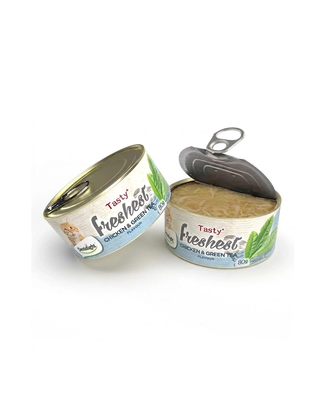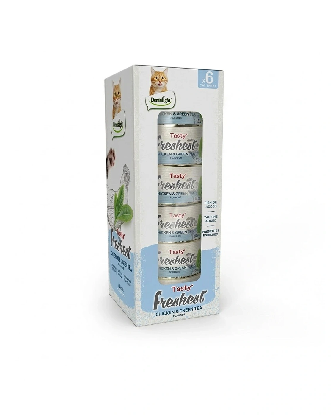Dentalight Tasty+ Freshest Cat Treat in Can (Chicken & Green Tea) is a high‑protein, low‑fat wet treat featuring real farm‑raised chicken and selected green tea extract. This 80g can offers a fresh, healthy option for cats over 6 months old. Formulated for easy digestion and high nutrient absorption, it includes taurine for cognitive and heart health, plus fish oil and vitamins for a shiny coat and healthy skin. A complementary snack ideal for daily rewarding.