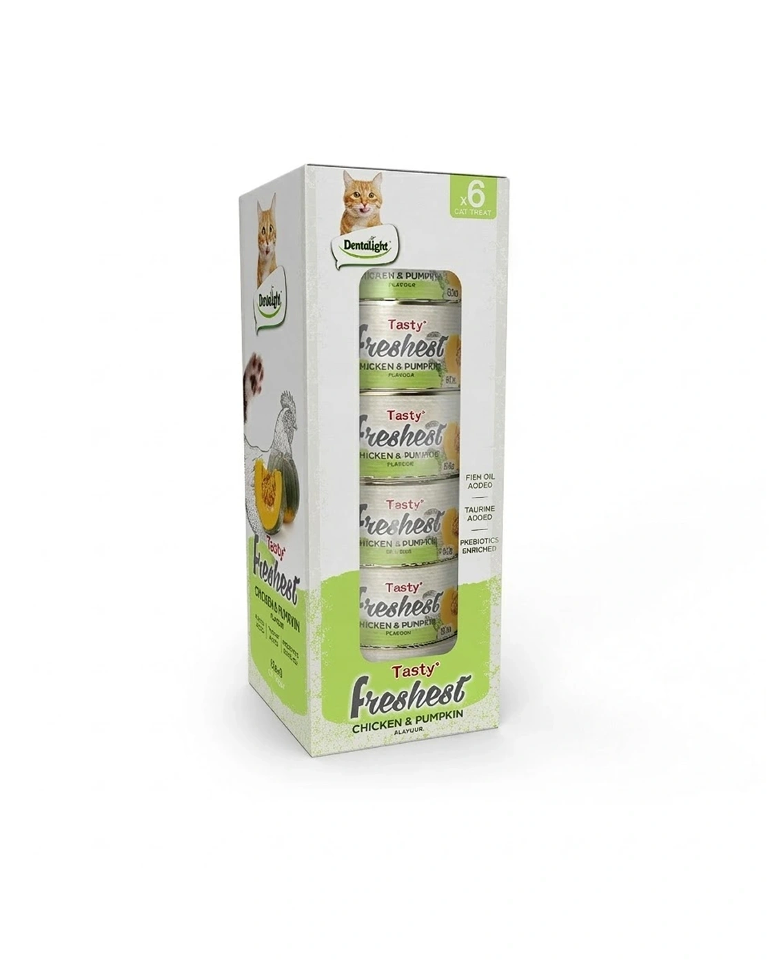 Dentalight Tasty + Freshest Chicken & Pumpkin Cat Treat is a high‑protein, low‑fat wet treat featuring real farm‑raised chicken and fresh pumpkin. Formulated for easy digestion, this complementary food includes salmon oil for skin and coat health, taurine for eye and heart health, and prebiotics (mannose‑oligosaccharides) to support digestive wellness. Suitable for cats over 6 months, it offers a delicious, nutritious reward in a convenient 80g can.