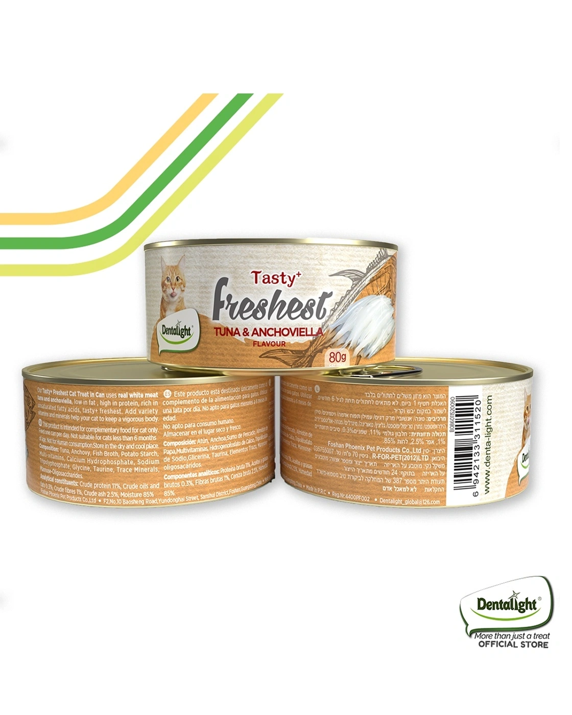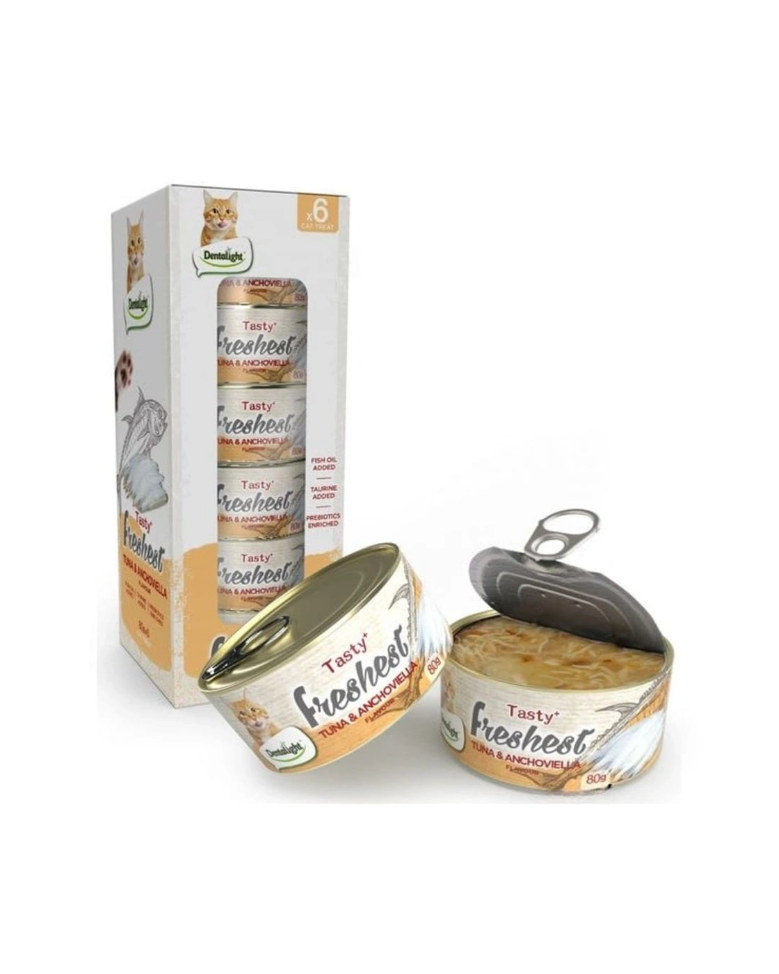Dentalight Tasty+ Freshest Tuna & Anchoviella Cat Treat is a high‑protein, low‑fat wet treat made with real white meat tuna and anchoviella (anchovy). Packed in an 80g can, this recipe is rich in unsaturated fatty acids and formulated with fish broth, multivitamins, taurine, and prebiotics (mannose‑oligosaccharides) to support digestive health, heart function, and overall vitality. A delicious, natural complementary snack for cats over 6 months.
