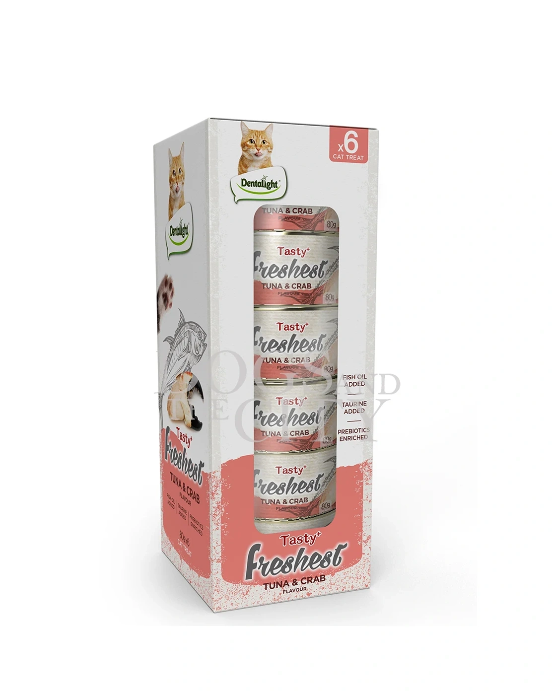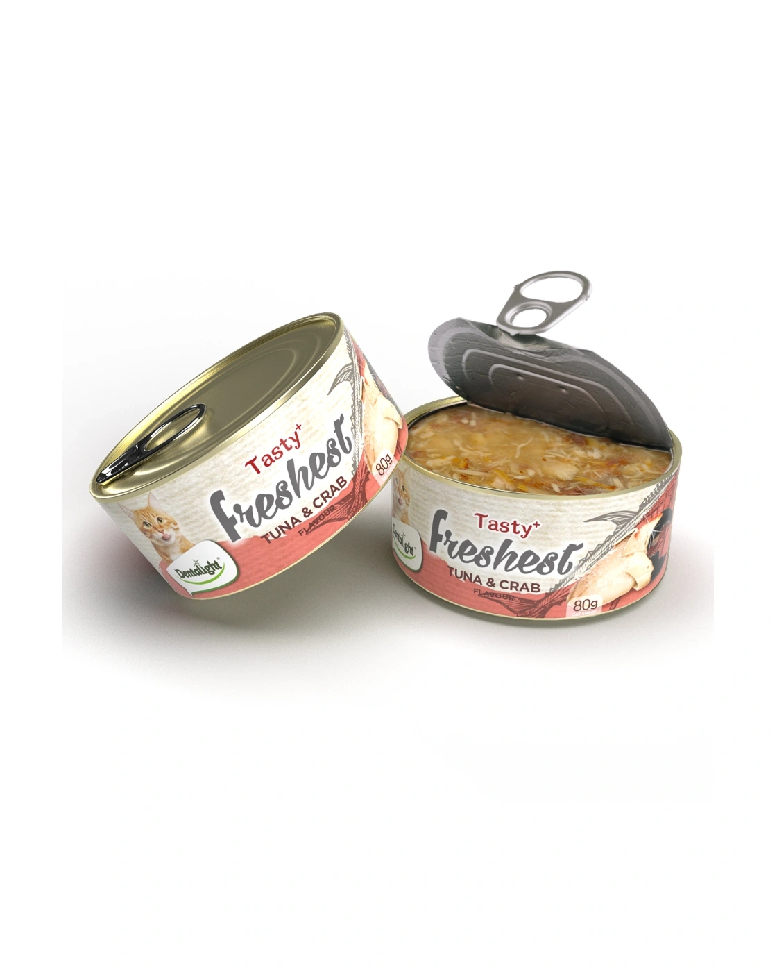 Dentalight Tasty+ Freshest Tuna & Crab Cat Treat is a high‑protein, low‑fat wet treat made with real white meat tuna and crab. Packed in a convenient 80g can, this recipe is rich in unsaturated fatty acids and formulated with fish oil for a shiny coat, taurine for brain and heart health, and prebiotics (mannose‑oligosaccharides) to protect the digestive system. Added multivitamins and minerals help keep your cat vigorous. 0% salt, no artificial colorants, and 100% natural ingredients make it a healthy, irresistible reward for cats over 6 months.