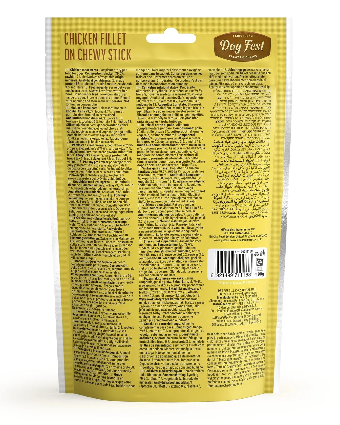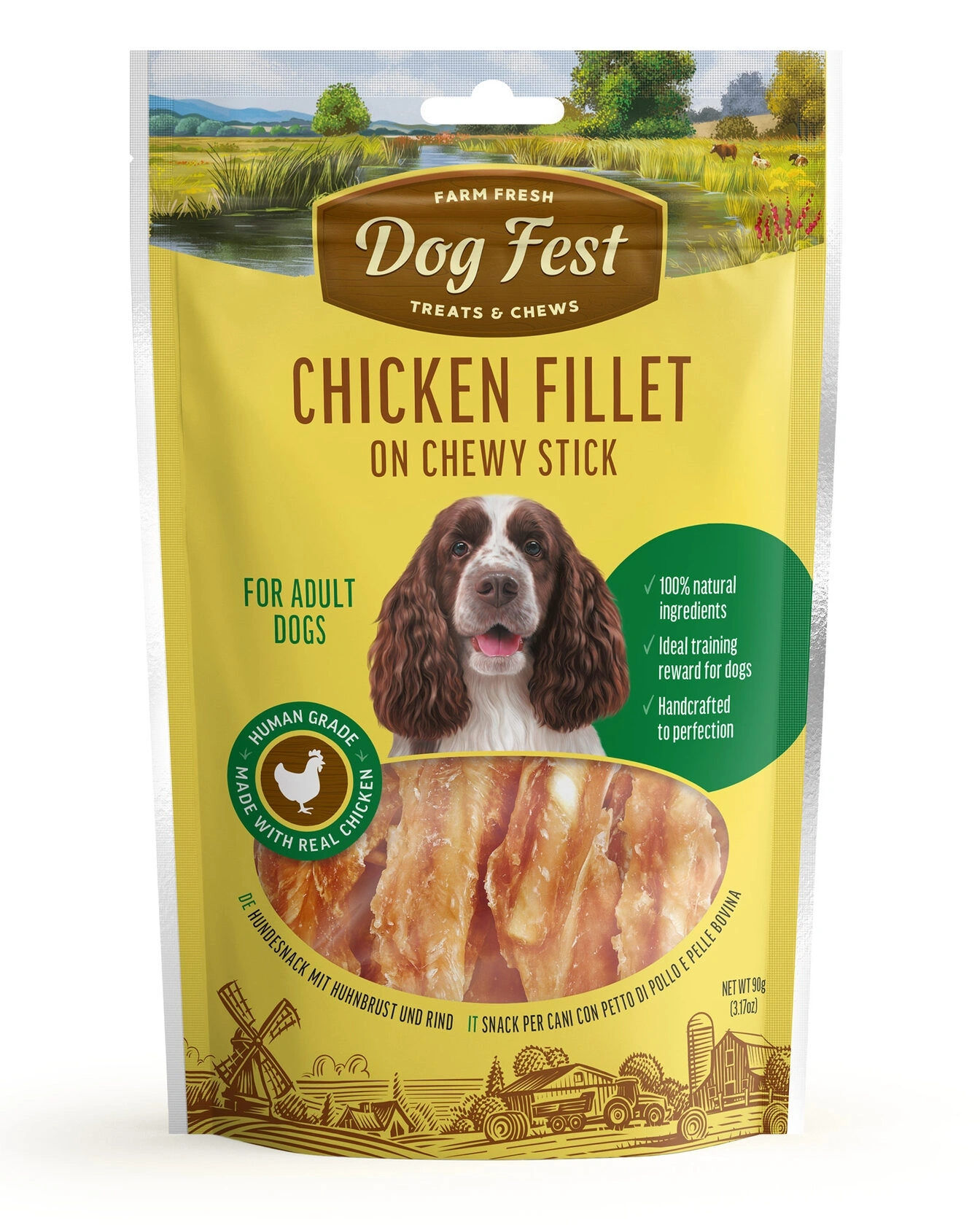 A rawhide stick covered with whole piece of chicken breast fillet. Let your dog have a great time chewing on a rawhide stick with the great taste of freshly cooked chicken.