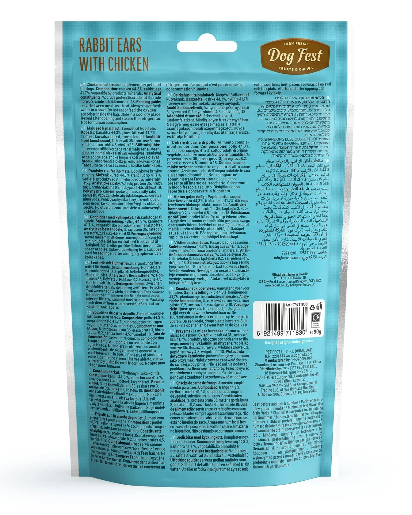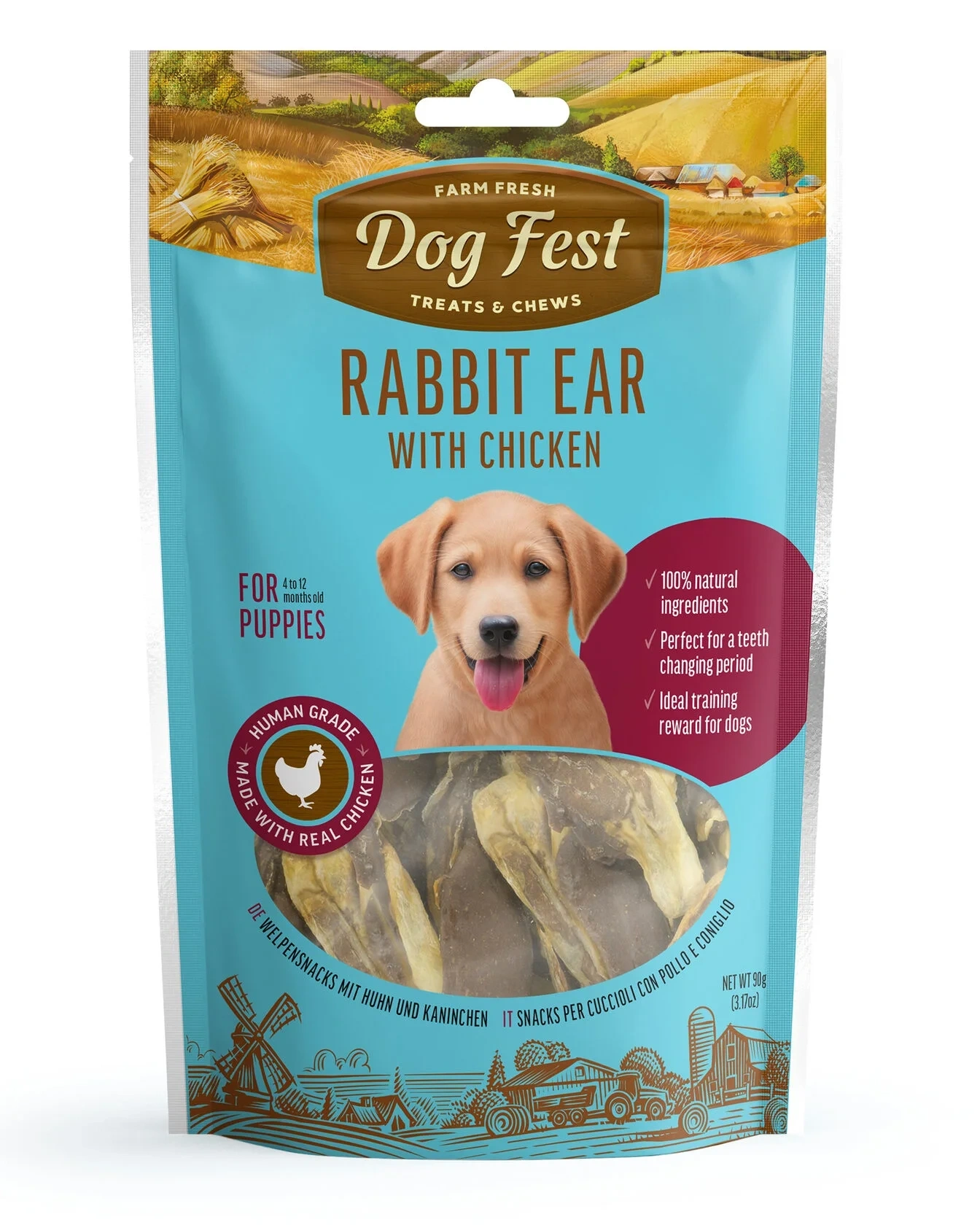 A combination of chewy rabbit ears and tender chicken meat creates a unique puppy treat. It lets your dog enjoy a great taste of farm fresh chicken as well as have a great time chewing on tender, yet chewy ears.