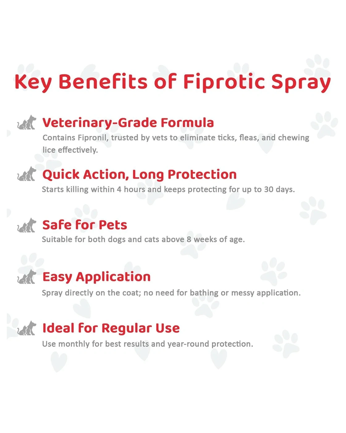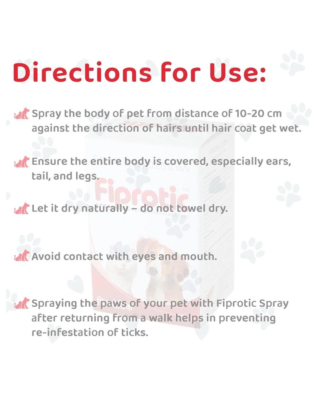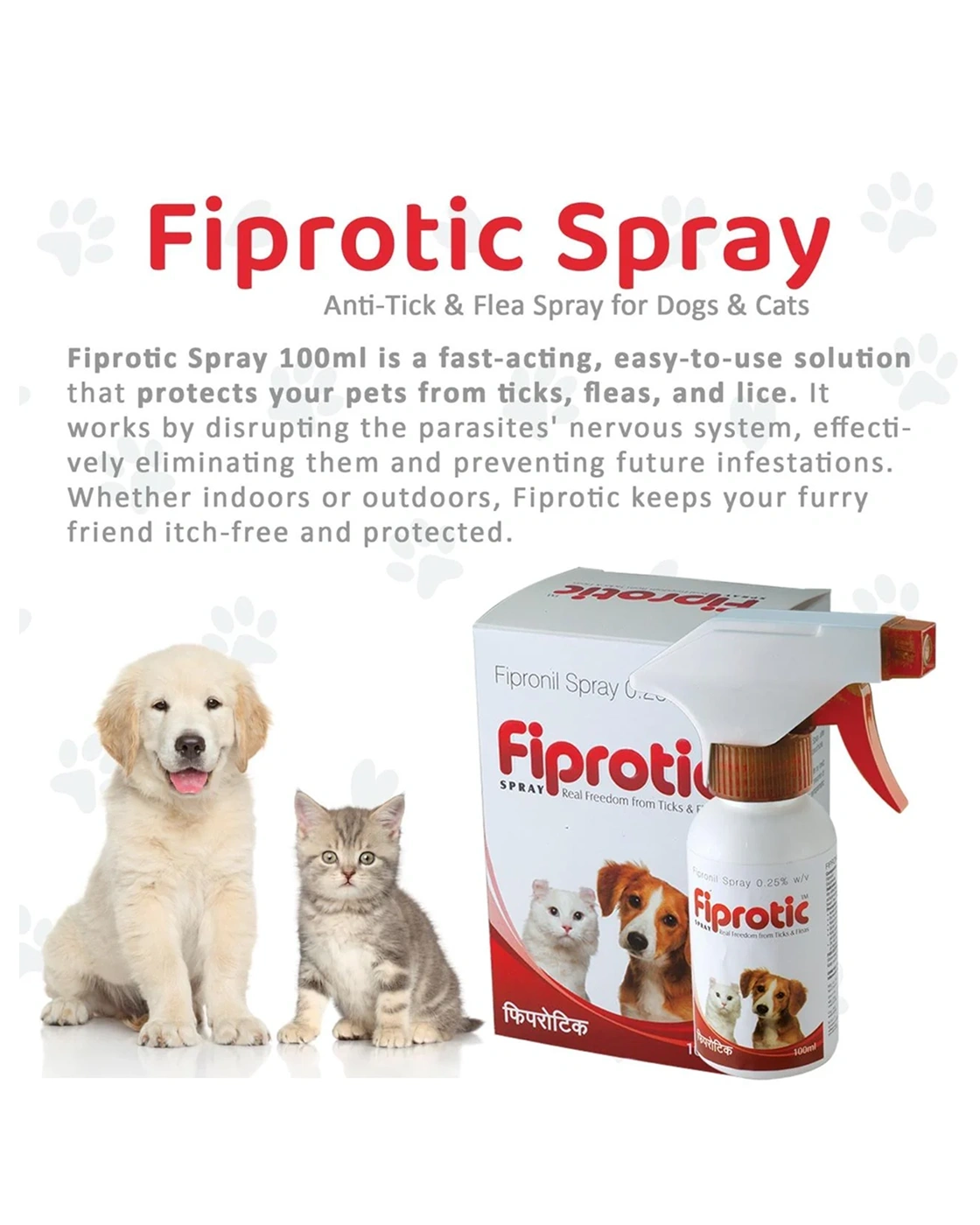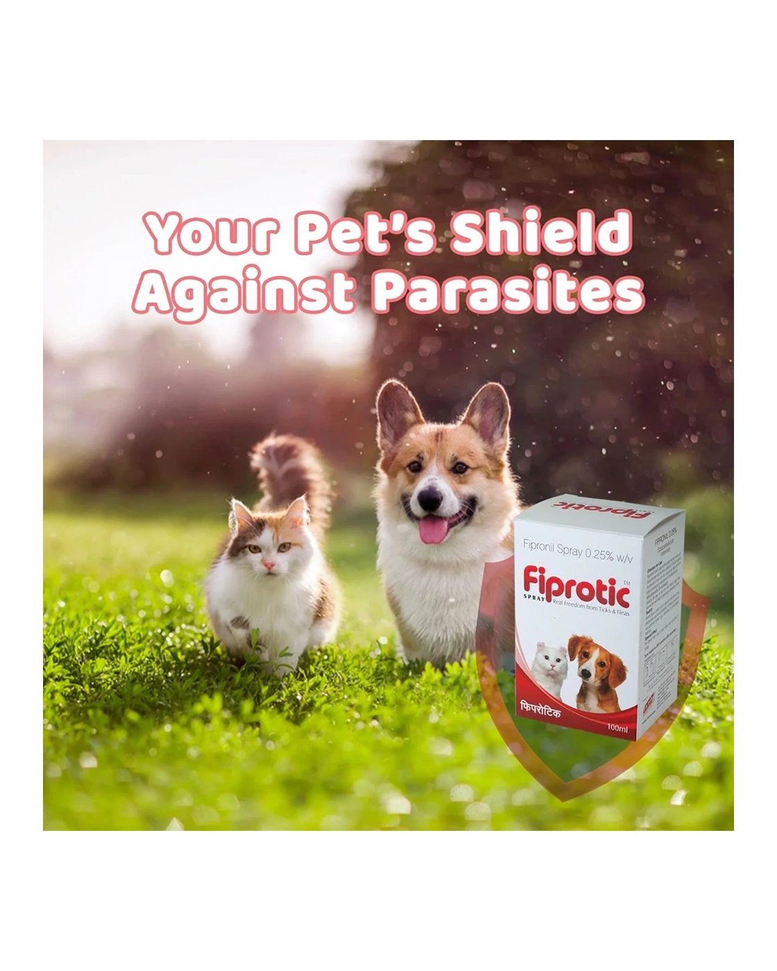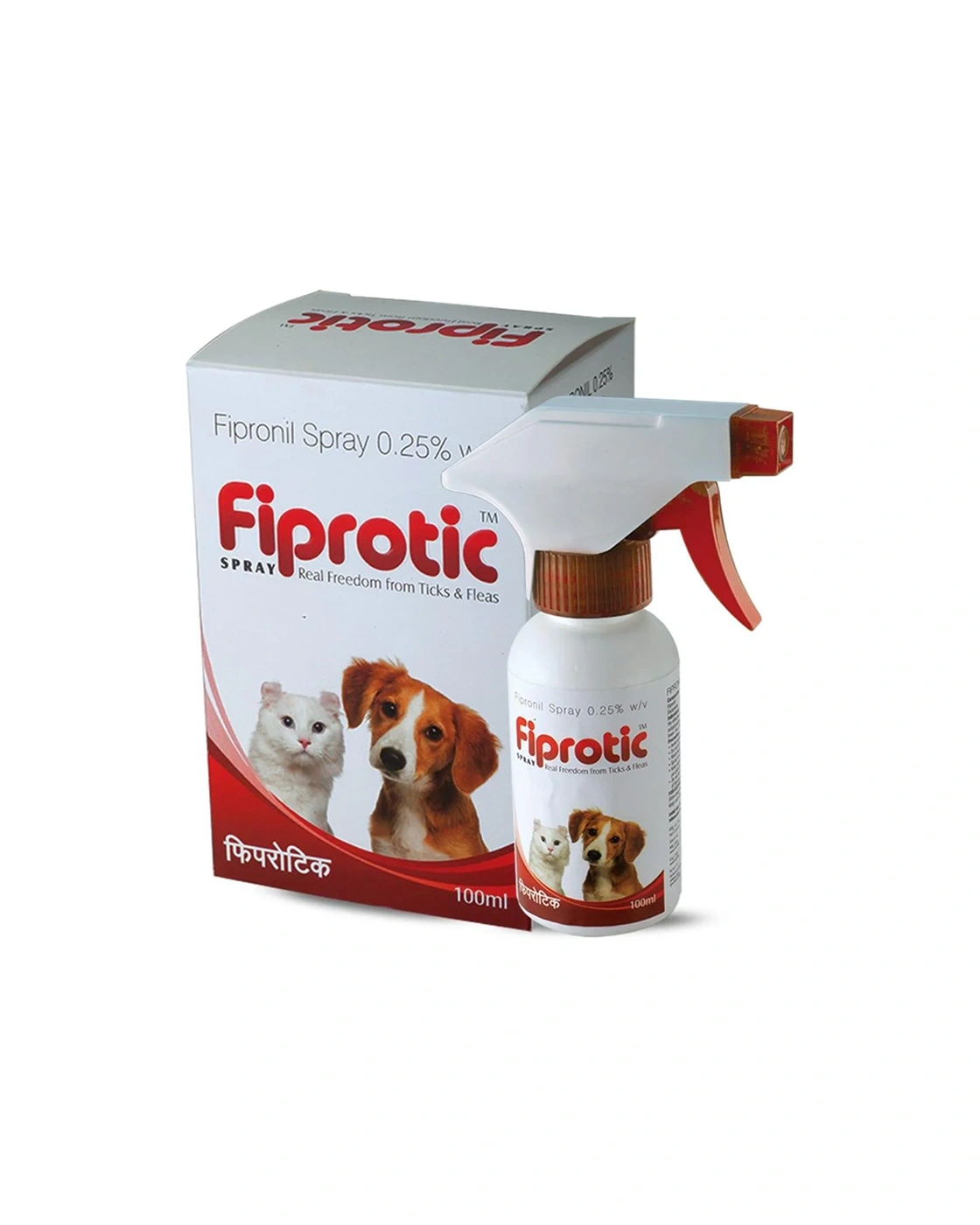Fiprotic Spray is a veterinary ectoparasiticide formulated with Fipronil 0.25% w/v (2.5 g/litre) for the effective treatment and prevention of ticks, fleas, lice, mites, and other ectoparasites in dogs and cats. This easy‑to‑use spray provides real freedom from parasites, targeting all life stages to break the infestation cycle. Made in India, Fiprotic Spray is a reliable solution for keeping your pet comfortable and parasite‑free.