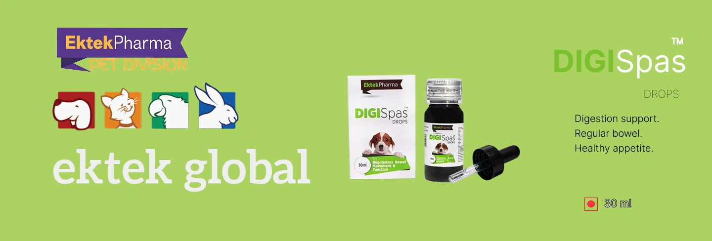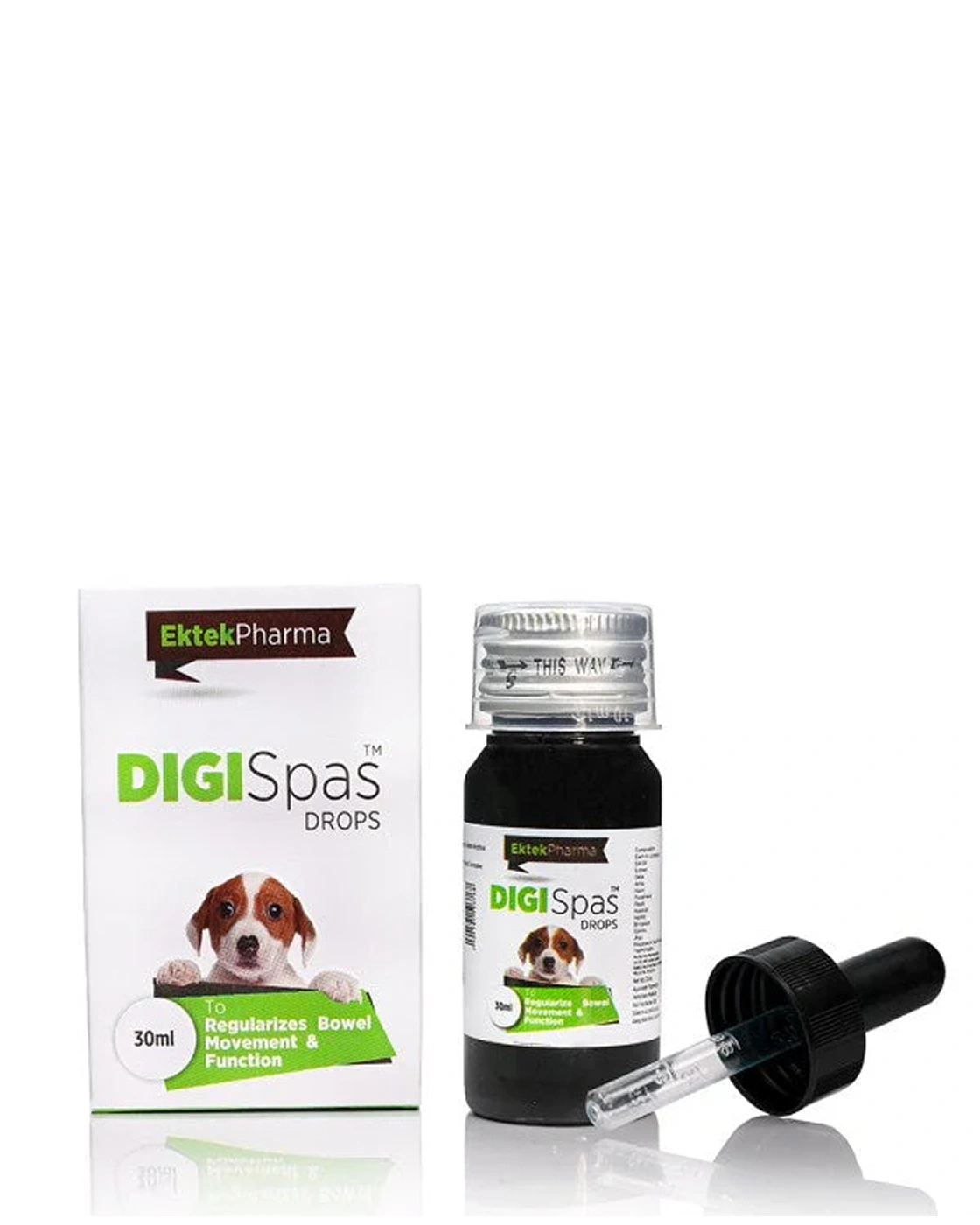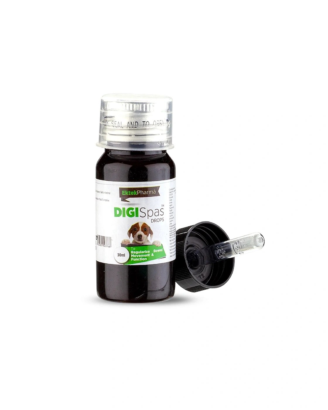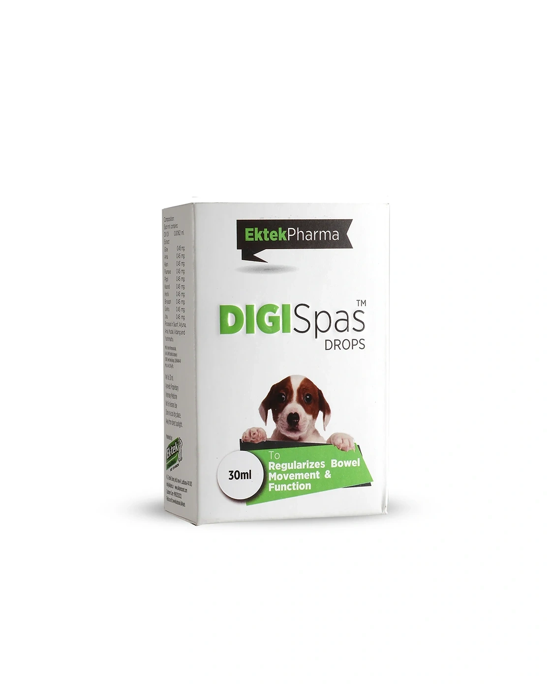 Digispas Drops is an Ayurvedic proprietary veterinary medicine formulated to help regulate bowel movement and support healthy digestive function in puppies, dogs, kittens, and cats. This natural herbal blend contains Dill Oil and extracts of Giloe, Amla, Kasni, Punarnava, Pippli, and other traditional herbs. It is especially useful for pets with irregular eating habits, during food transitions, or when experiencing common digestive discomfort.