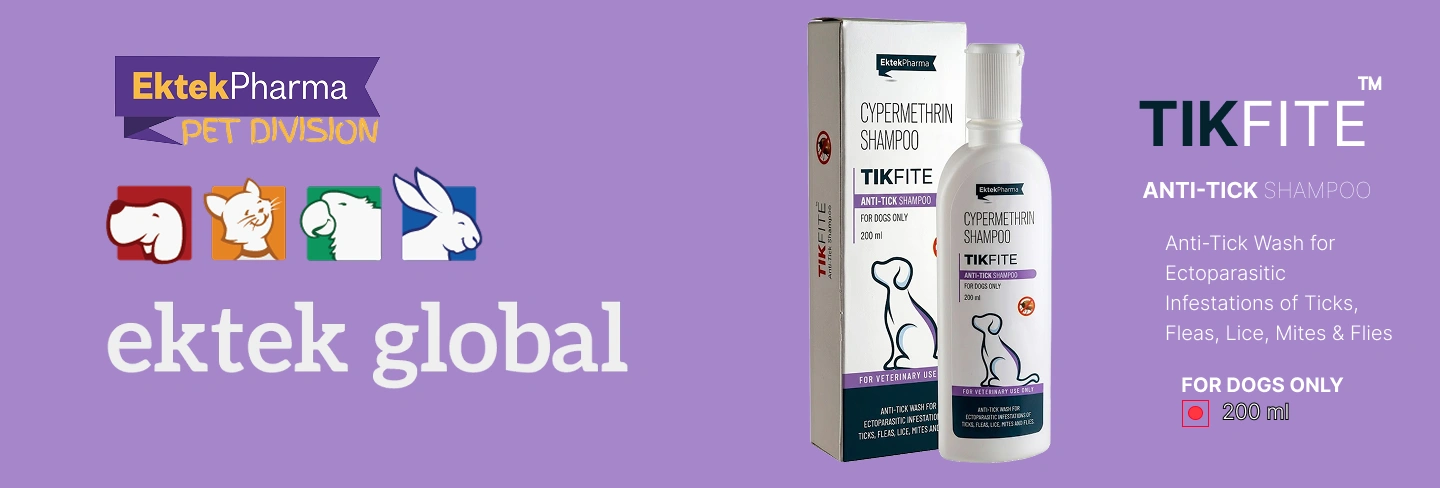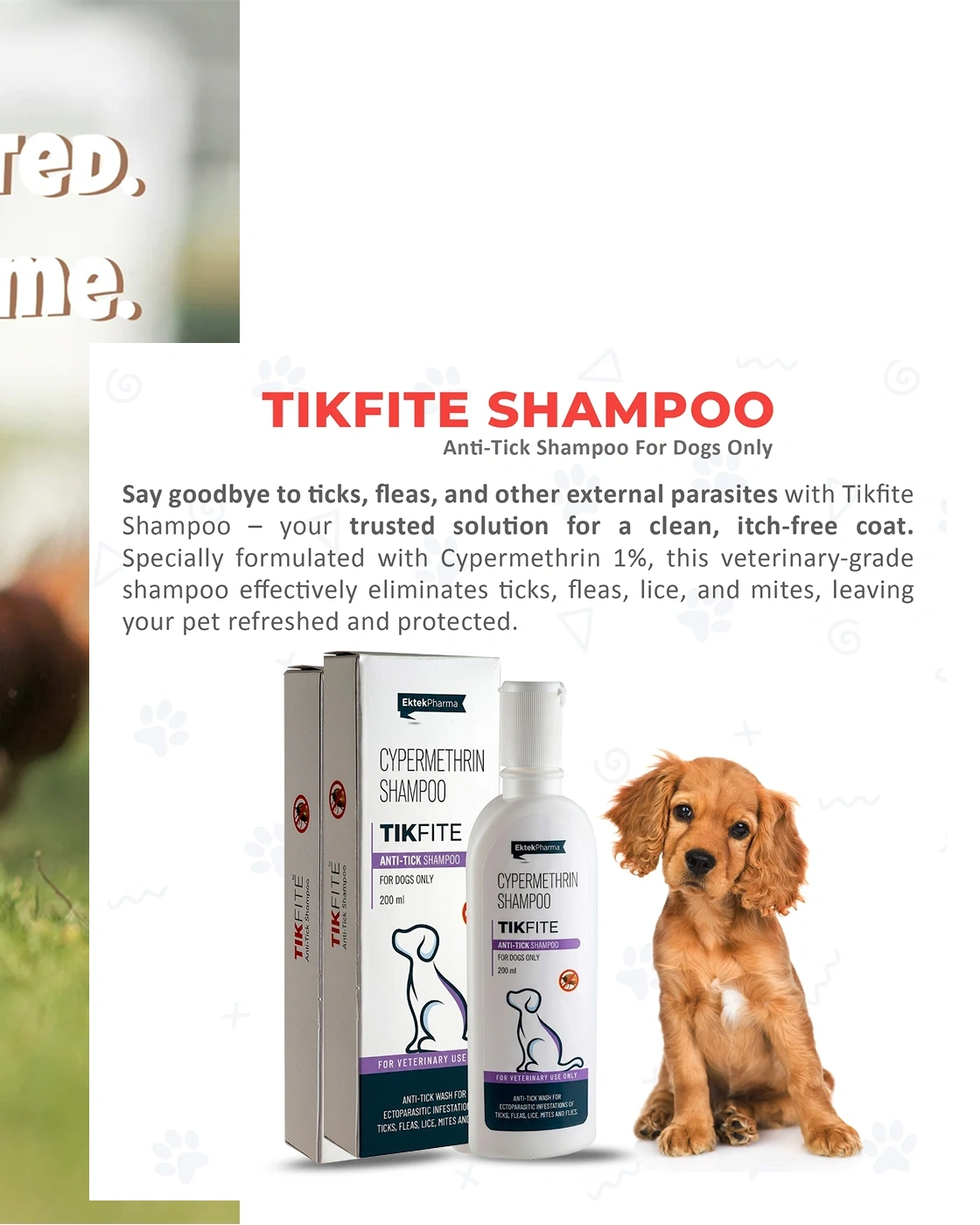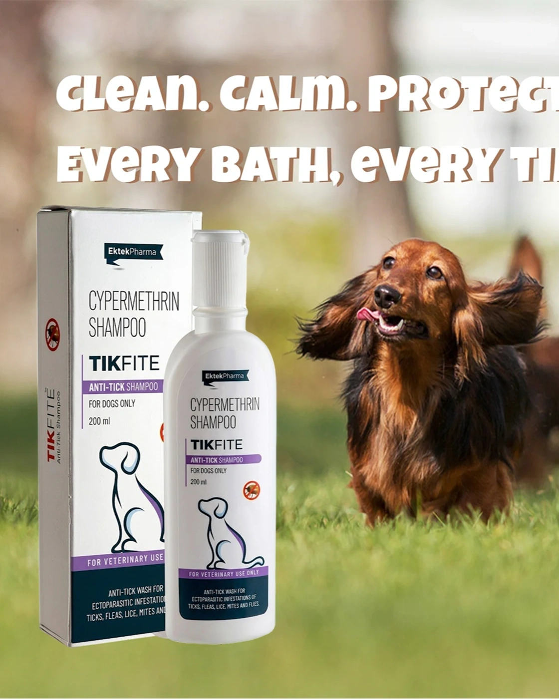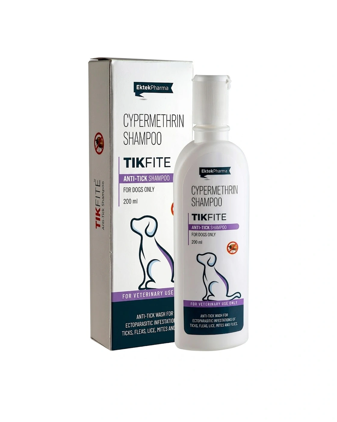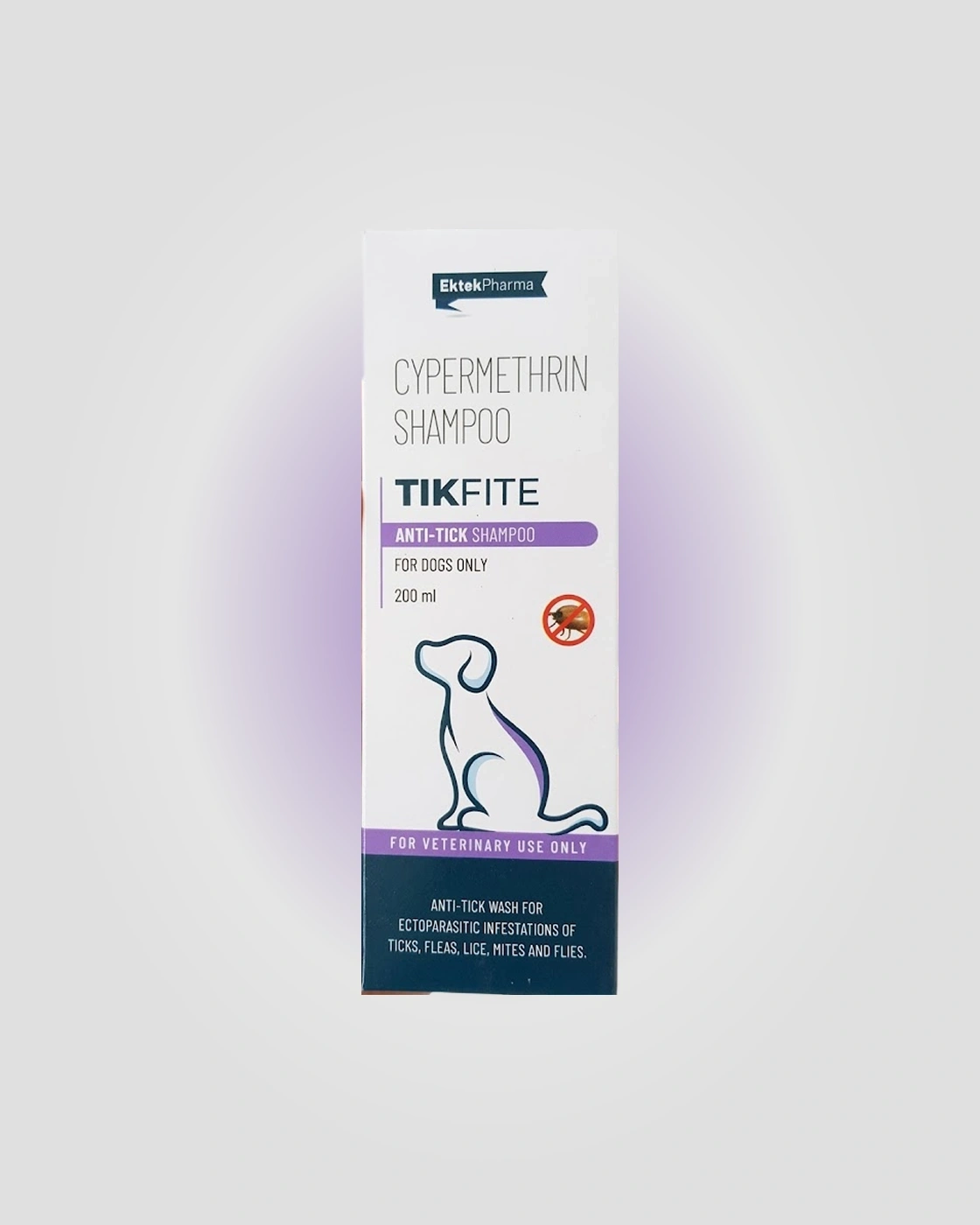 TikFite Anti Tick Shampoo by Ektek Pharma is a powerful, veterinary‑grade liquid shampoo formulated with Cypermethrin 1% w/v (BP Standard) to effectively kill and repel ticks, fleas, and lice on dogs. It provides rapid action and long‑lasting protection, helping your dog stay healthy, itch‑free, and comfortable. This gentle formula not only eliminates existing parasites but also helps prevent re‑infestation, leaving the coat clean, smooth, and refreshed. Available in multiple sizes, it is suitable for regular grooming of all dog breeds.