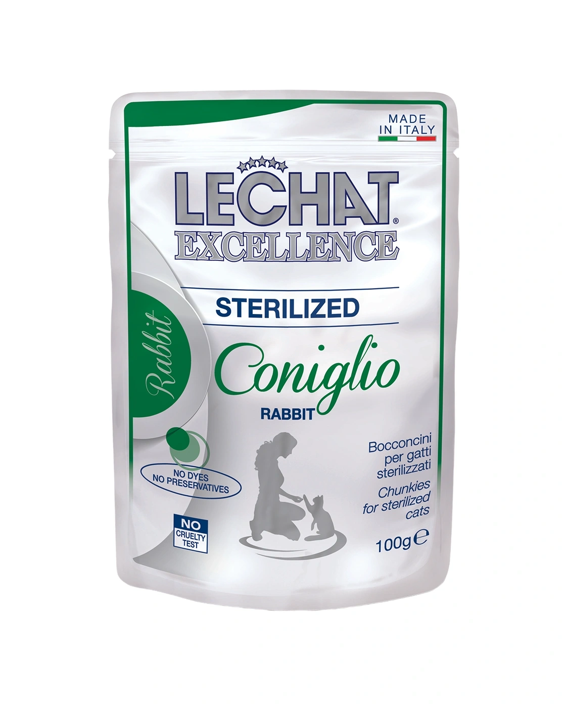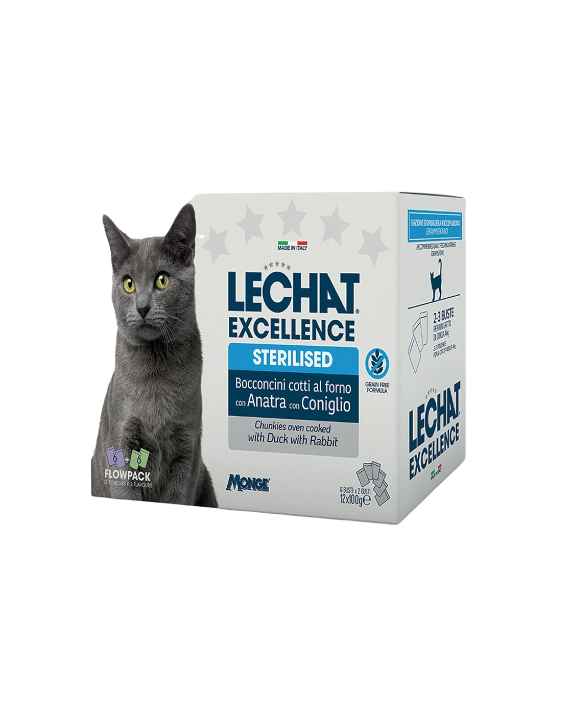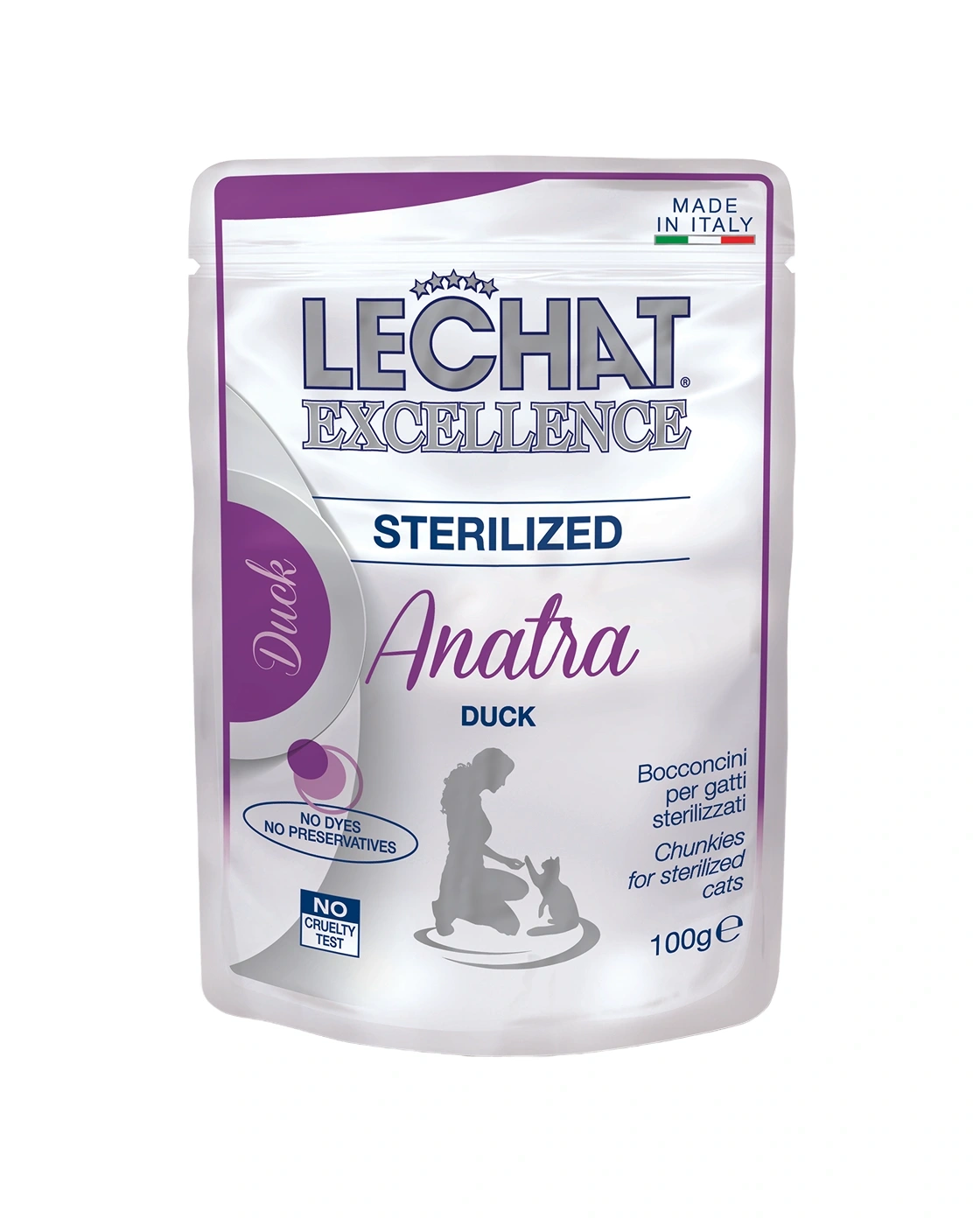 LECHAT EXCELLENCE CHUNKIES WITH DUCK & RABBIT is a complete food for sterilised cats aged 12 months plus. A recipe made in Italy, without artificial coloring, preservatives or added sugar.