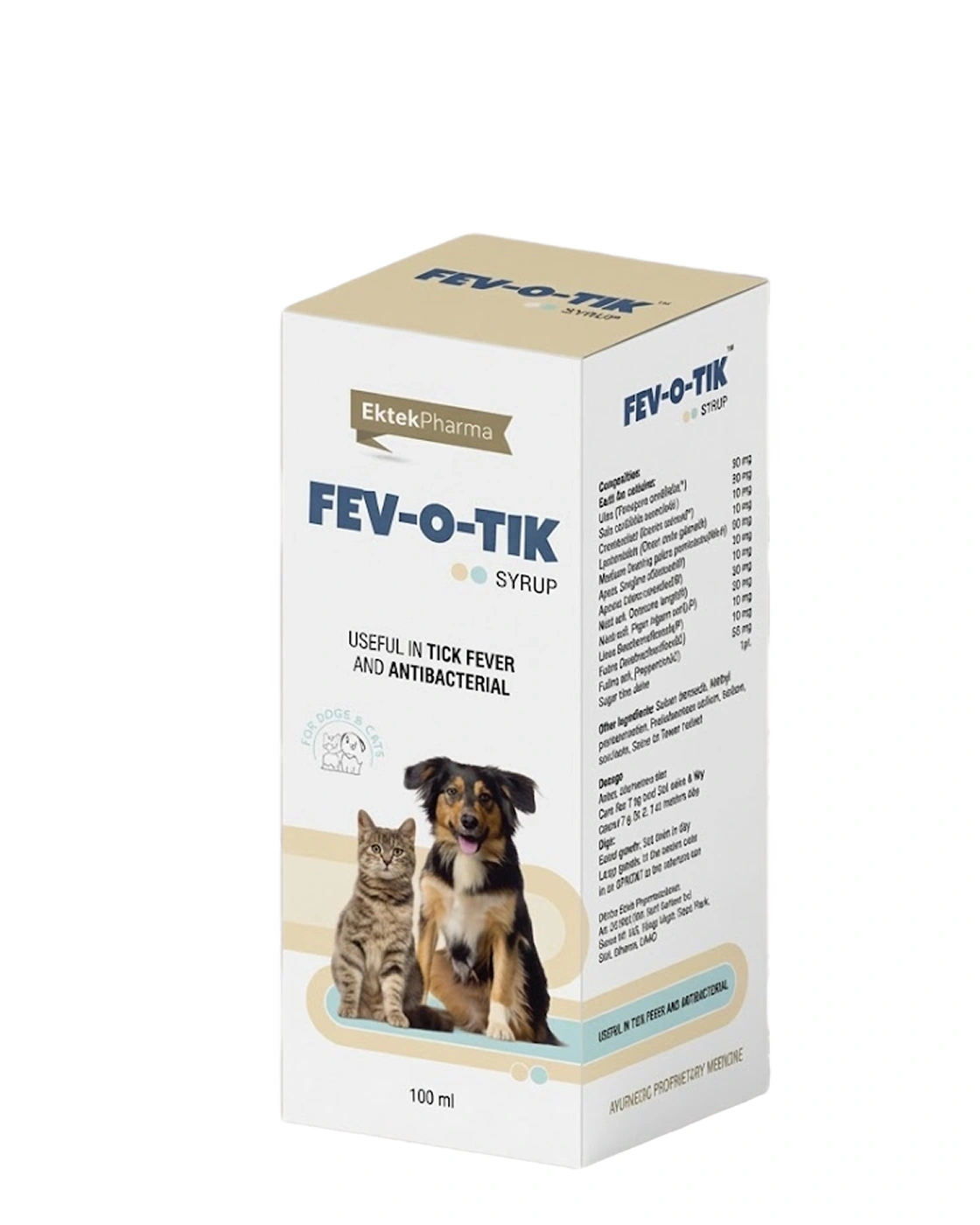 FEV‑O‑TIK Syrup is an Ayurvedic veterinary formulation designed to help manage fever, cold, cough, and body pain in dogs and cats. It combines traditional herbs known for their antipyretic, immunomodulatory, and analgesic properties to support recovery from viral or bacterial infections, including tick fever. The natural formula helps reduce fever, ease discomfort, and boost overall immunity.