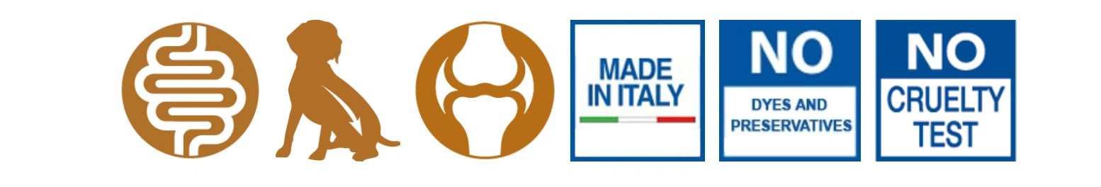 Cereals (rice 5%), meat and animal derivatives 25% (fresh chicken meat 5%, chondroitin sulphate 0.04%), oils and fats, fish and fish derivatives, derivatives of vegetable origin (beet pulp 2%, fructo-oligosaccharides FOS 1%, yucca schidigera 0.1%), minerals, molluscs and crustaceans (glucosamine 0.026%).