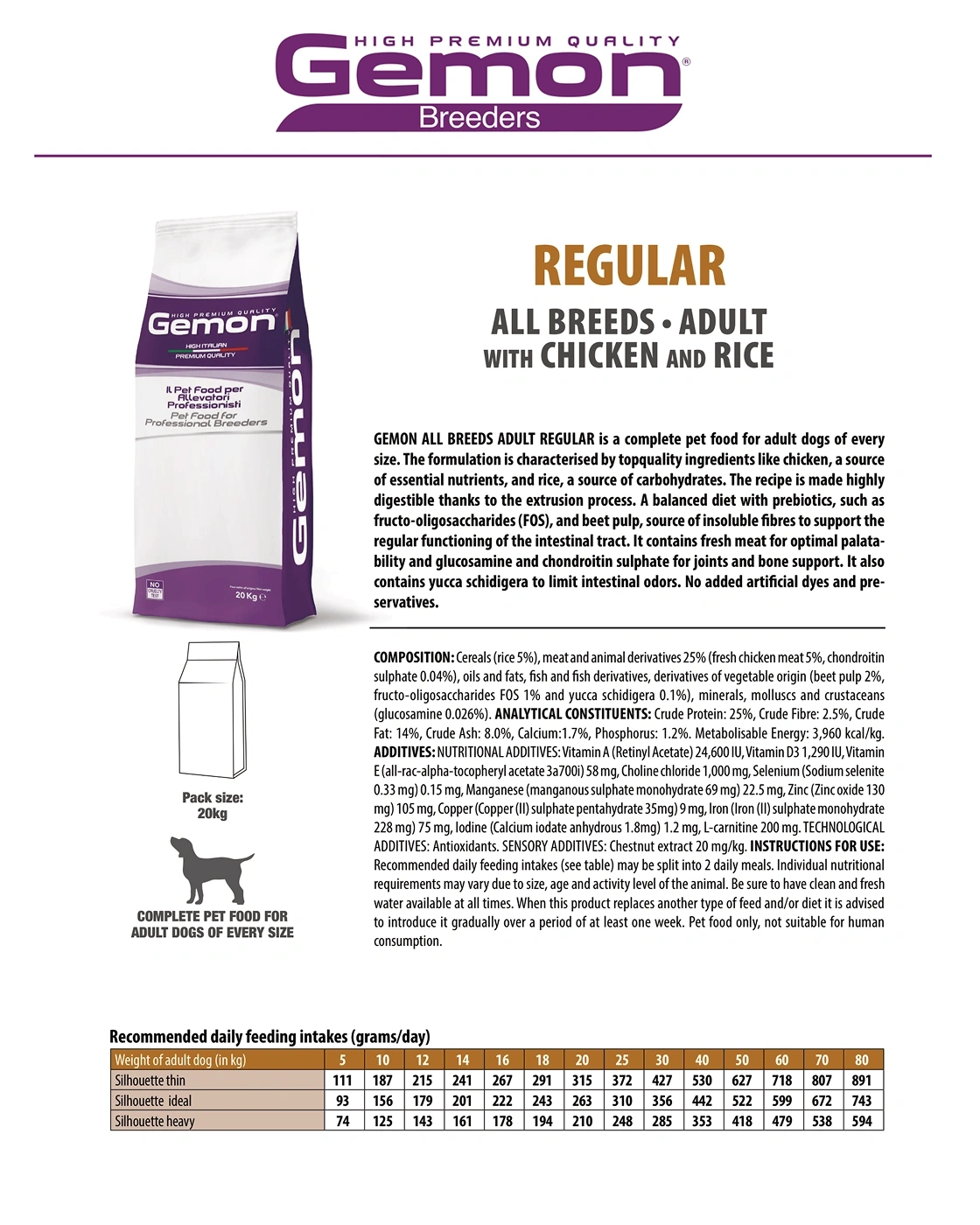 When introducing GEMON Regular Adult, transition gradually over at least one week by mixing with the previous food. This complete pet food is formulated for dogs only and not suitable for human consumption.