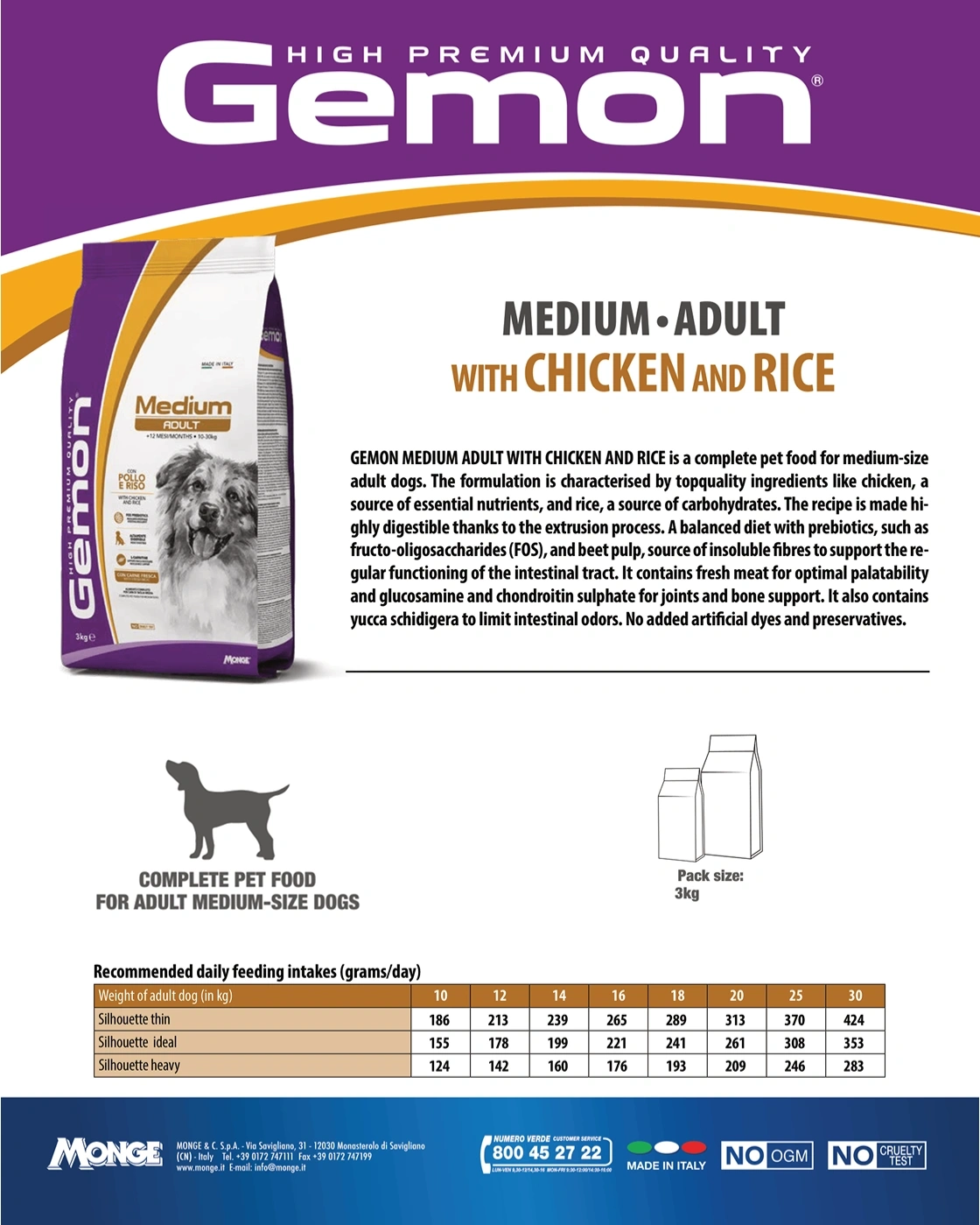 GEMON MEDIUM ADULT WITH CHICKEN AND RICE is a complete pet food for medium-size adult dogs. The formulation is characterised by top-quality ingredients like chicken, a source of essential nutrients, and rice, a source of carbohydrates. The recipe is made highly digestible thanks to the extrusion process. A balanced diet with prebiotics, such as fructo-oligosaccharides (FOS), and beet pulp, source of insoluble fibres to support the regular functioning of the intestinal tract. It contains fresh meat for optimal palatability and glucosamine and chondroitin sulphate for joints and bone support. It also contains yucca schidigera to limit intestinal odors. No added artificial dyes and preservatives.