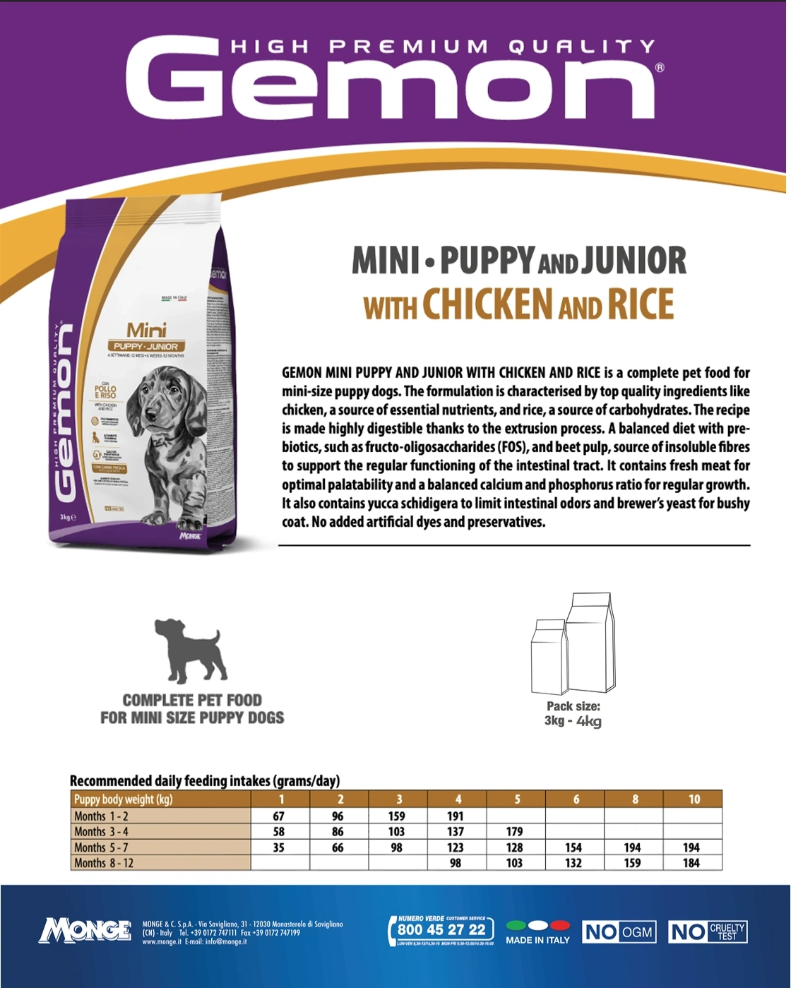 When introducing Gemon Mini Puppy & Junior, transition gradually over at least one week by mixing with the previous food. This complete pet food is formulated for dogs only and not suitable for human consumption.