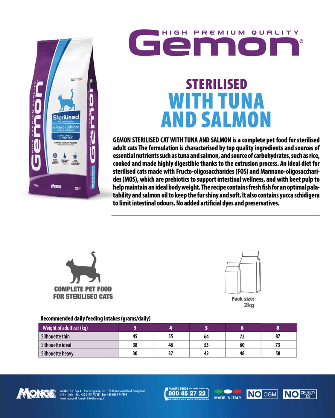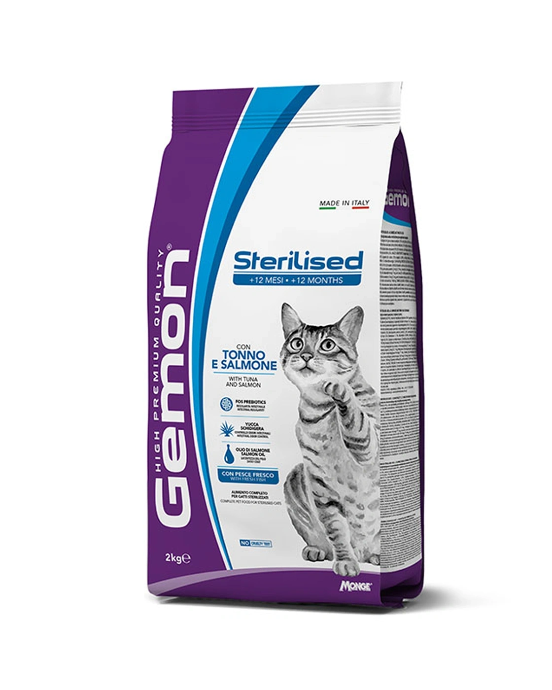 Gemon Sterilised Cat with Tuna and Salmon is a complete pet food for sterilised adult cats. The formulation is characterised by top‑quality ingredients and sources of essential nutrients, such as tuna and salmon, and a source of carbohydrates, such as rice, cooked and made highly digestible thanks to the extrusion process.
