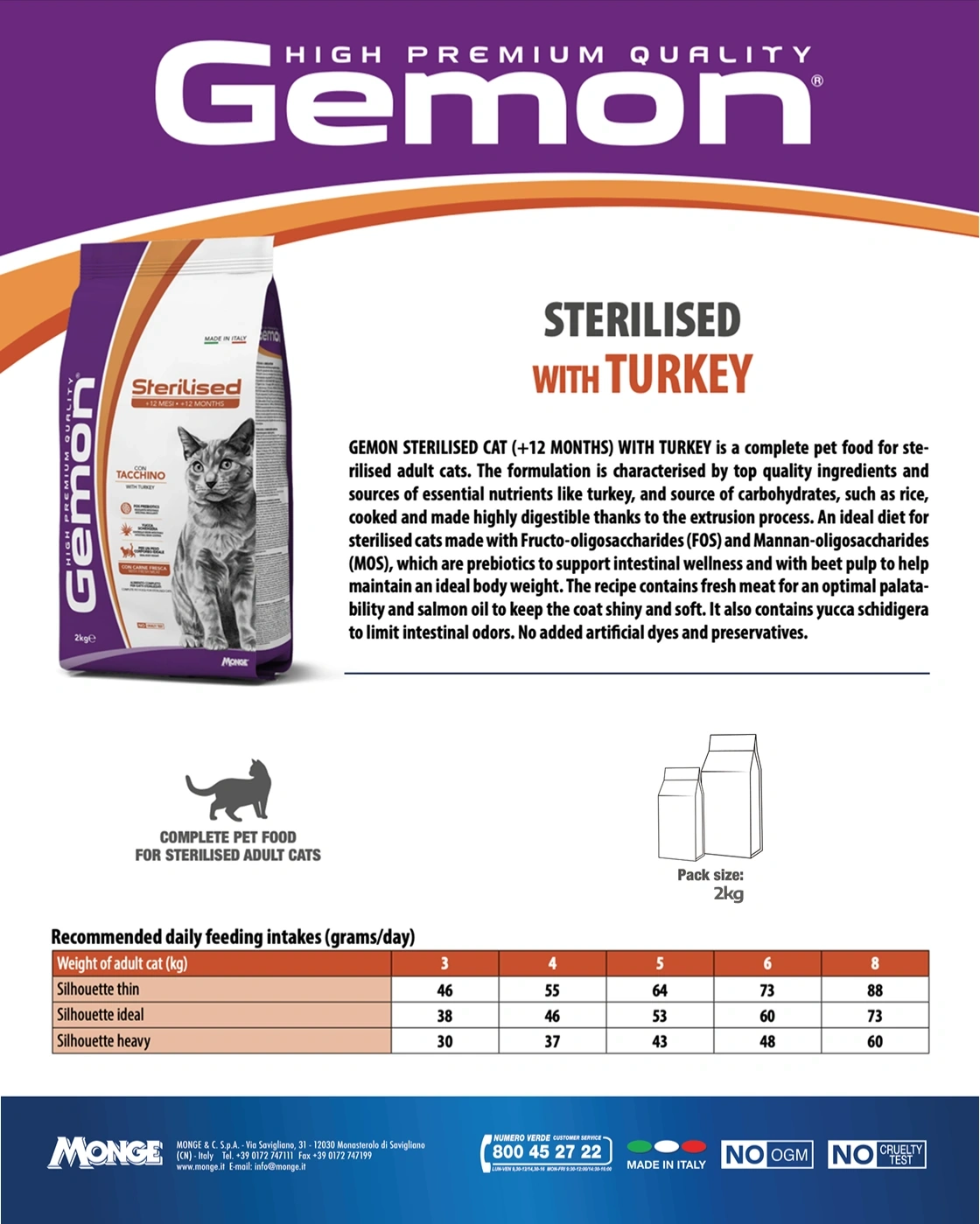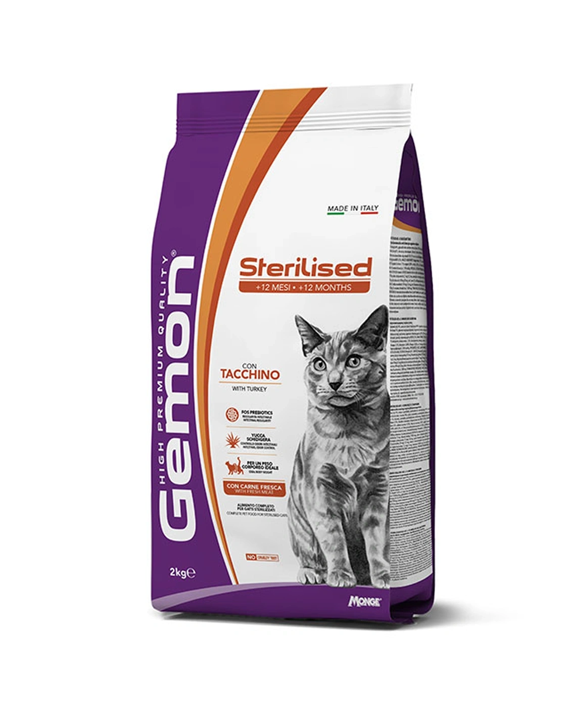 Gemon Sterilised Cat with Turkey is a complete pet food for sterilised adult cats (+12 months). The formulation is characterised by top‑quality ingredients and sources of essential nutrients like turkey, and a source of carbohydrates, such as rice, cooked and made highly digestible thanks to the extrusion process.