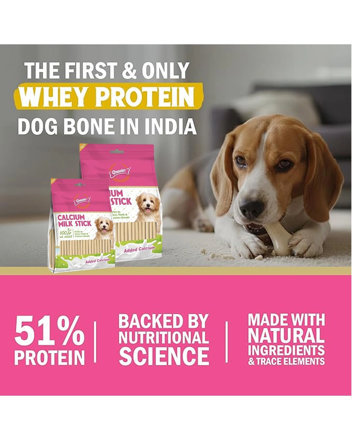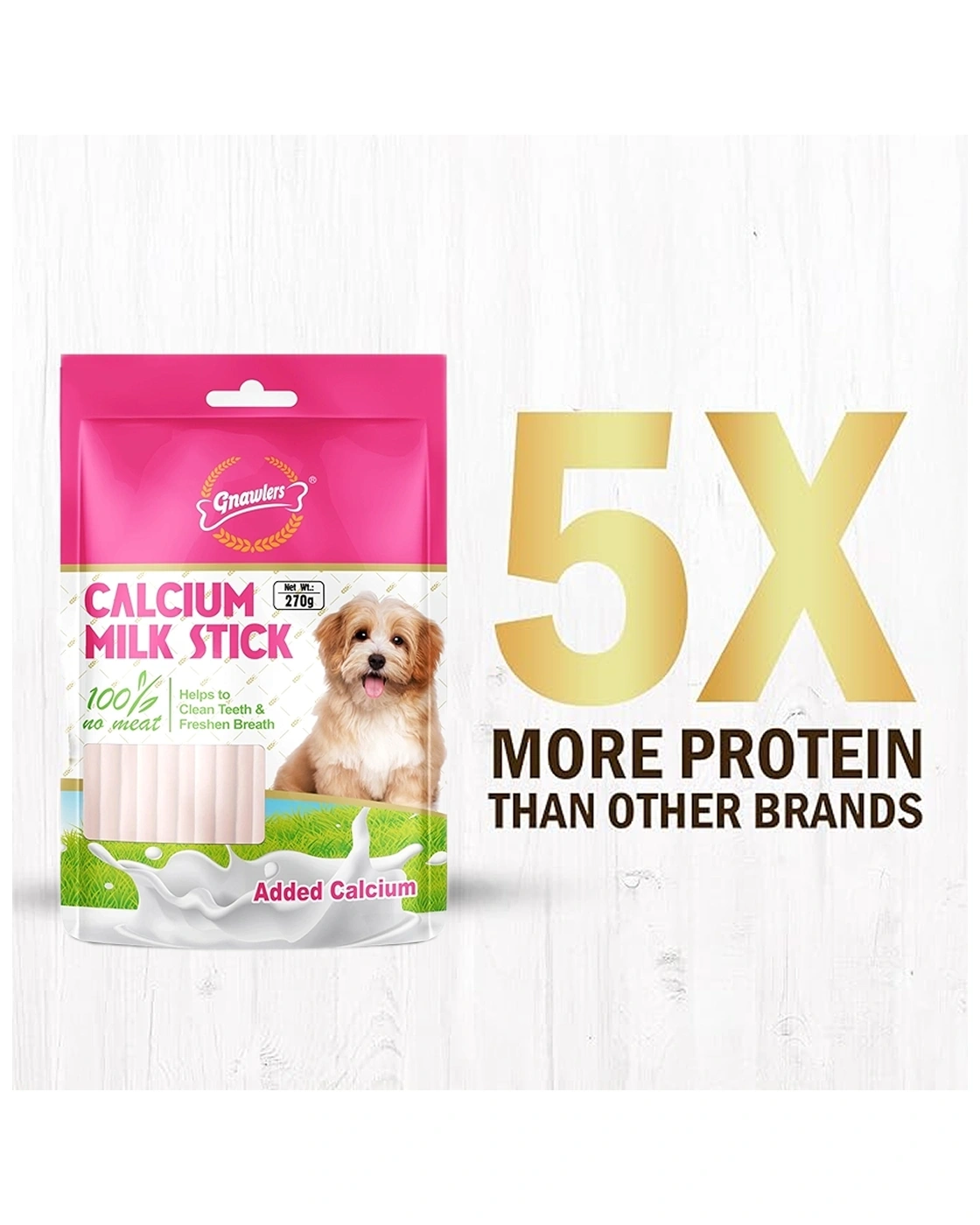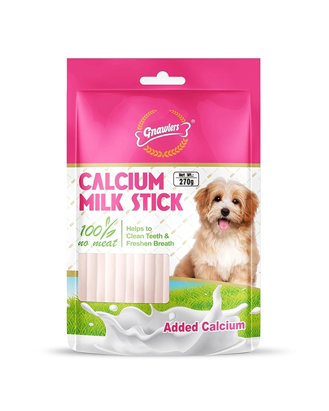 Gnawlers Calcium Milk Stick is a premium quality, vegetarian dental chew treat made with high‑grade ingredients and delicious milk flavor. Its unique twisted shape improves teeth cleaning ability while your dog chews, helping to rub off tartar and plaque from teeth and gums, and freshening breath. Enriched with milk powder and calcium, this stick supports strong bones and muscles, improves digestive health, and satisfies your dog’s natural chewing instinct. Suitable for dogs of all breeds from 2 months onwards.