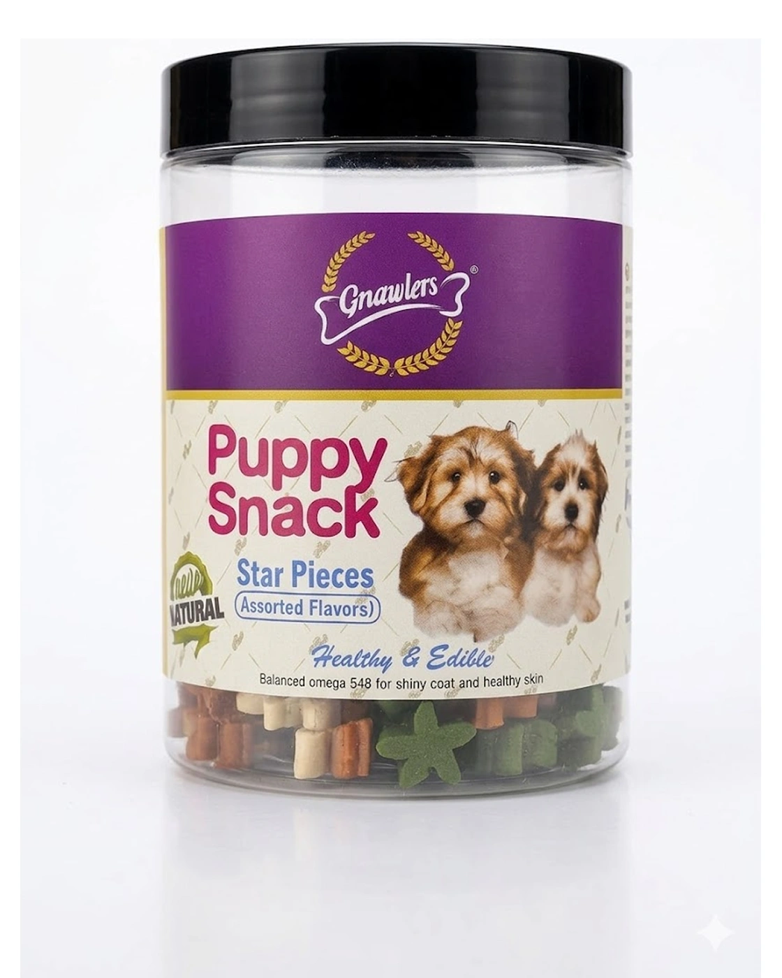 Gnawlers Puppy Snack Star Pieces are popular, assorted‑flavor star‑shaped treats designed specifically for training and rewarding puppies. These nutritious snacks support dental, bone, and eye health with added minerals, calcium, vitamins, and taurine. Available in a variety of flavors (pork, beef, milk, mint, chicken) in one pack to prevent boredom, these star‑shaped pieces make treat time fun, engaging, and healthy for growing dogs.
