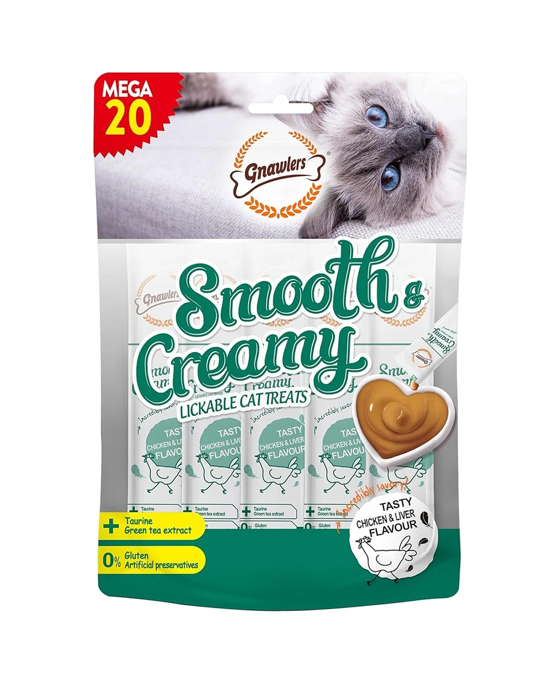 Gnawlers Smooth Creamy Treats with Chicken and Liver (FI300G) is a premium, lickable, wet, non‑vegetarian cat treat formulated for adult, senior, and young cats. Featuring a creamy, smooth texture and irresistible chicken & liver flavor, it is highly palatable – perfect for even the pickiest eaters. Enriched with taurine to support eyesight and heart health, omega‑6 fatty acids for skin and coat care, and green tea extract to aid digestion, this high‑protein snack is gluten‑free and preservative‑free. Ideal for hand‑feeding, bowl serving, or as a meal topper.
