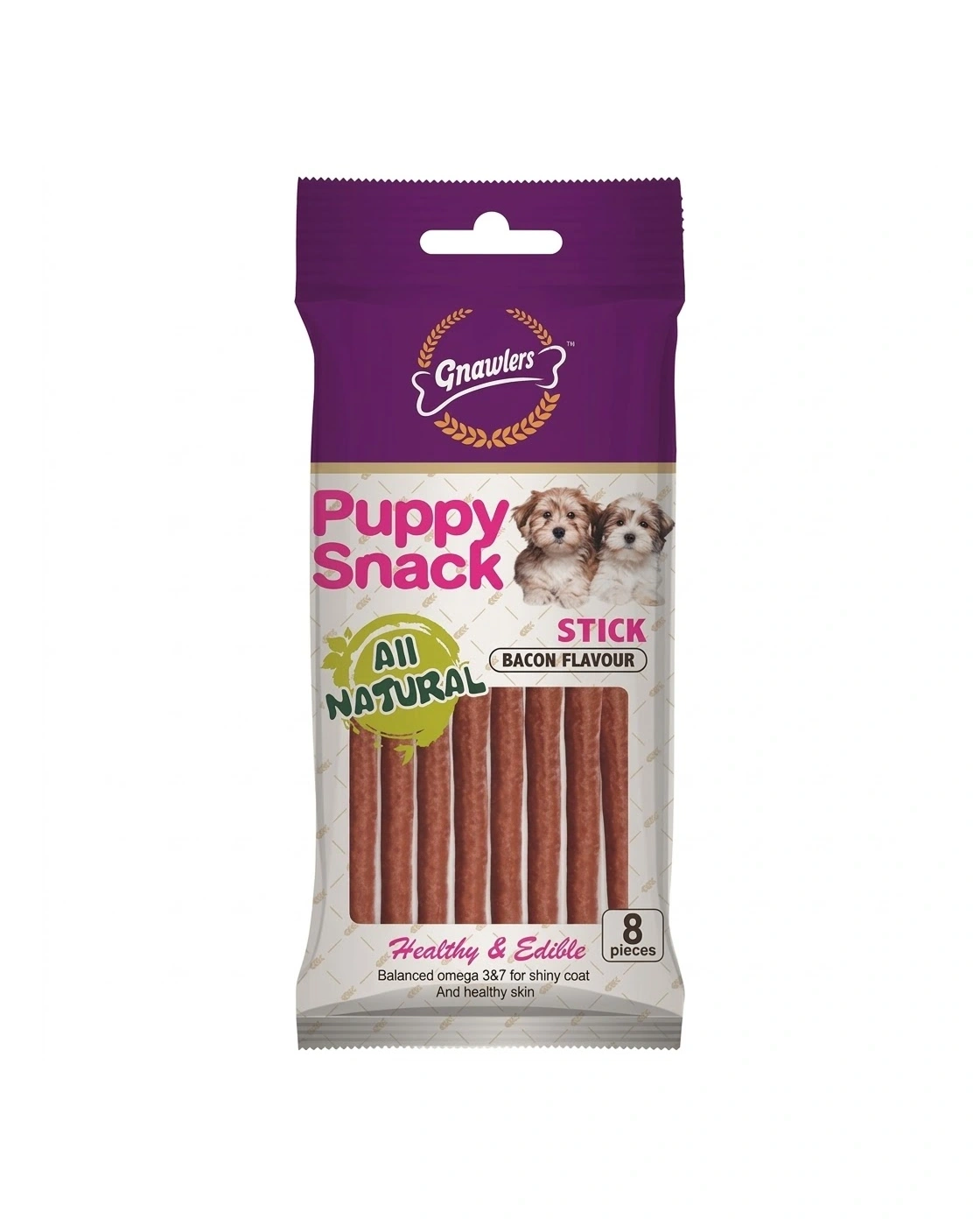 Gnawlers Stick Bacon Flavours are premium, edible dental snack sticks specifically formulated for puppies of all breeds. This 80g pack contains 8 savory bacon‑flavored sticks designed to satisfy a puppy’s natural urge to chew while supporting dental health. Made with 100% natural ingredients and free from artificial colors or flavorings, these highly digestible, high‑protein, high‑fiber treats help clean teeth, freshen breath, reduce plaque and tartar, and promote healthier skin, a shinier coat, and stronger muscles and bones.