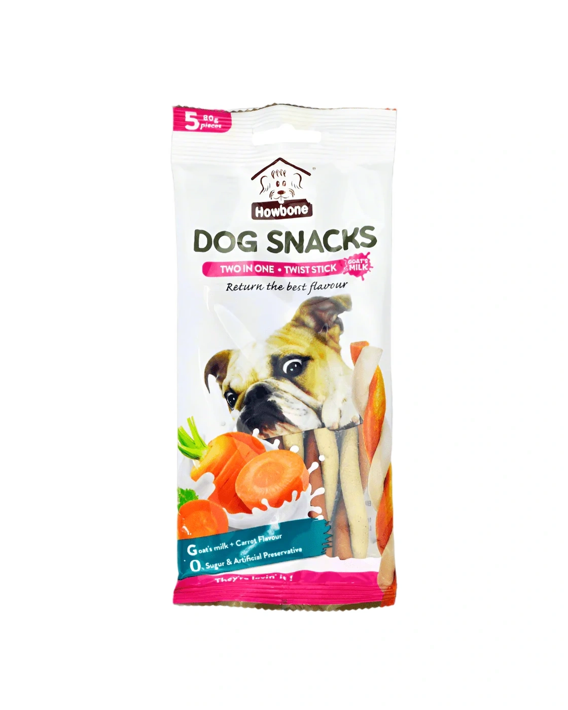 Howbone 2‑in‑1 Twist Sticks combine premium goat milk (approx. 10%) with wholesome carrot in a tender, chewy treat designed to support dental health and provide essential nutrients. These low‑fat, highly digestible snacks help remove plaque and tartar through natural abrasive chewing action. Enriched with calcium for strong teeth and bones, and taurine to aid brain development and eye health, they are free from added sugar and artificial preservatives. Perfect for training or daily rewards.
