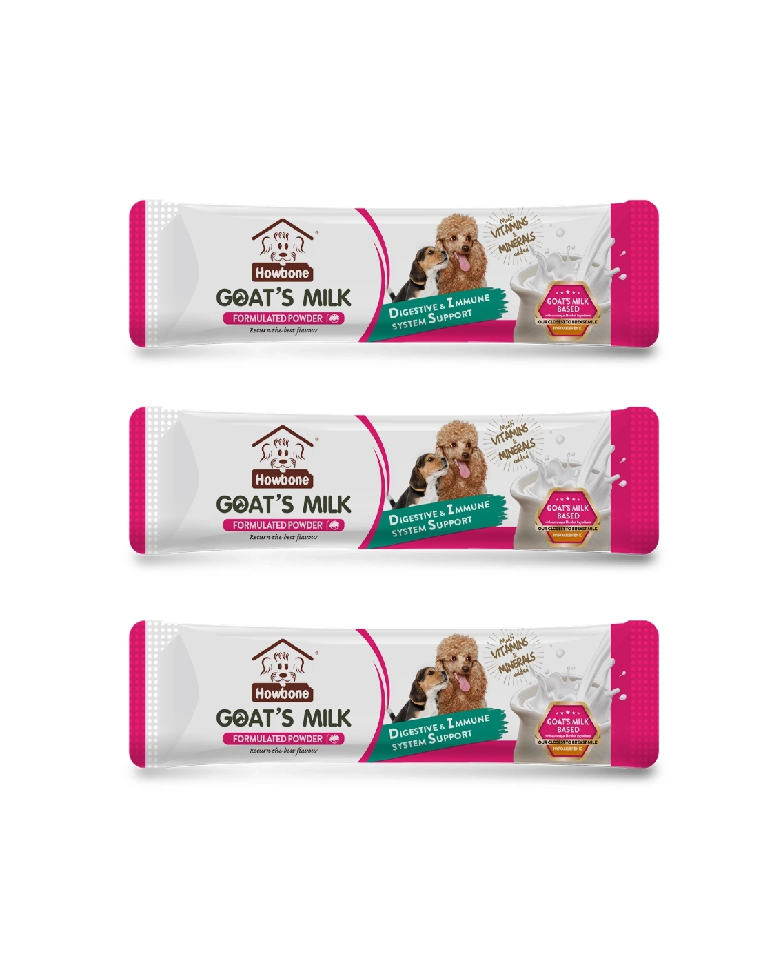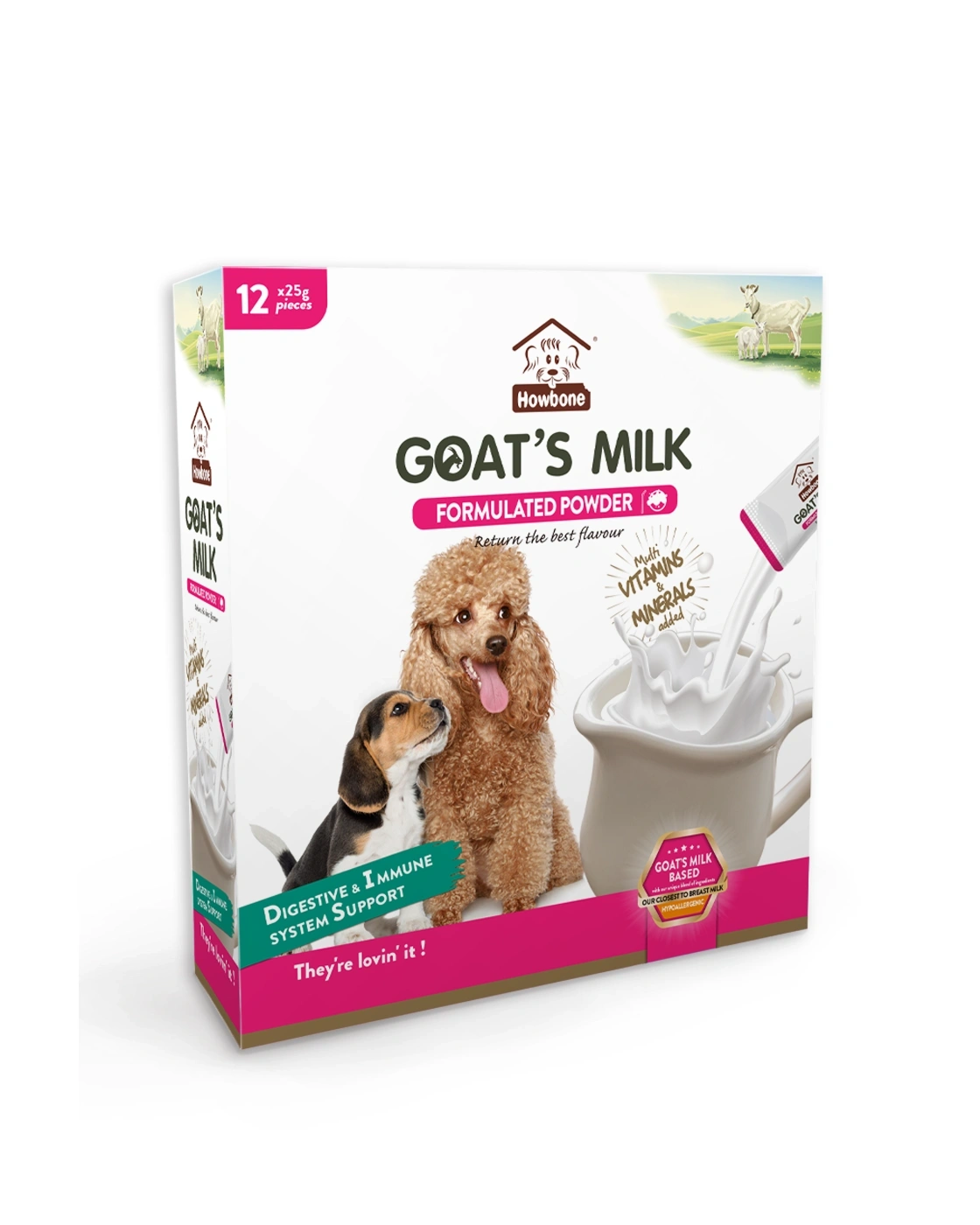 HOWBONE Goat's Milk Formulated Powder is a premium, hypoallergenic complementary feed designed for dogs of all life stages. Made with whole goat milk powder (35%), this unique blend is closest to breast milk, offering superior nutrition that is gentle on digestion and supports bone development. Enriched with a complete spectrum of vitamins (A, B1, B2, B3, B6, B12, E, folic acid, biotin) and essential trace elements (iron, copper, zinc, iodine, selenium), it ensures proper growth, development, and overall wellness. No artificial colorants, 100% natural.