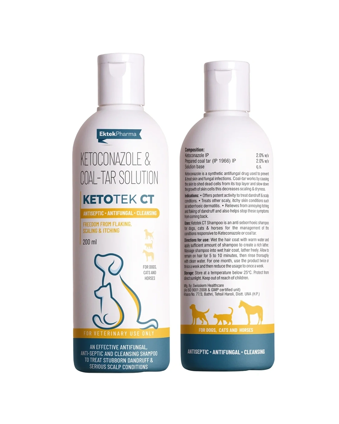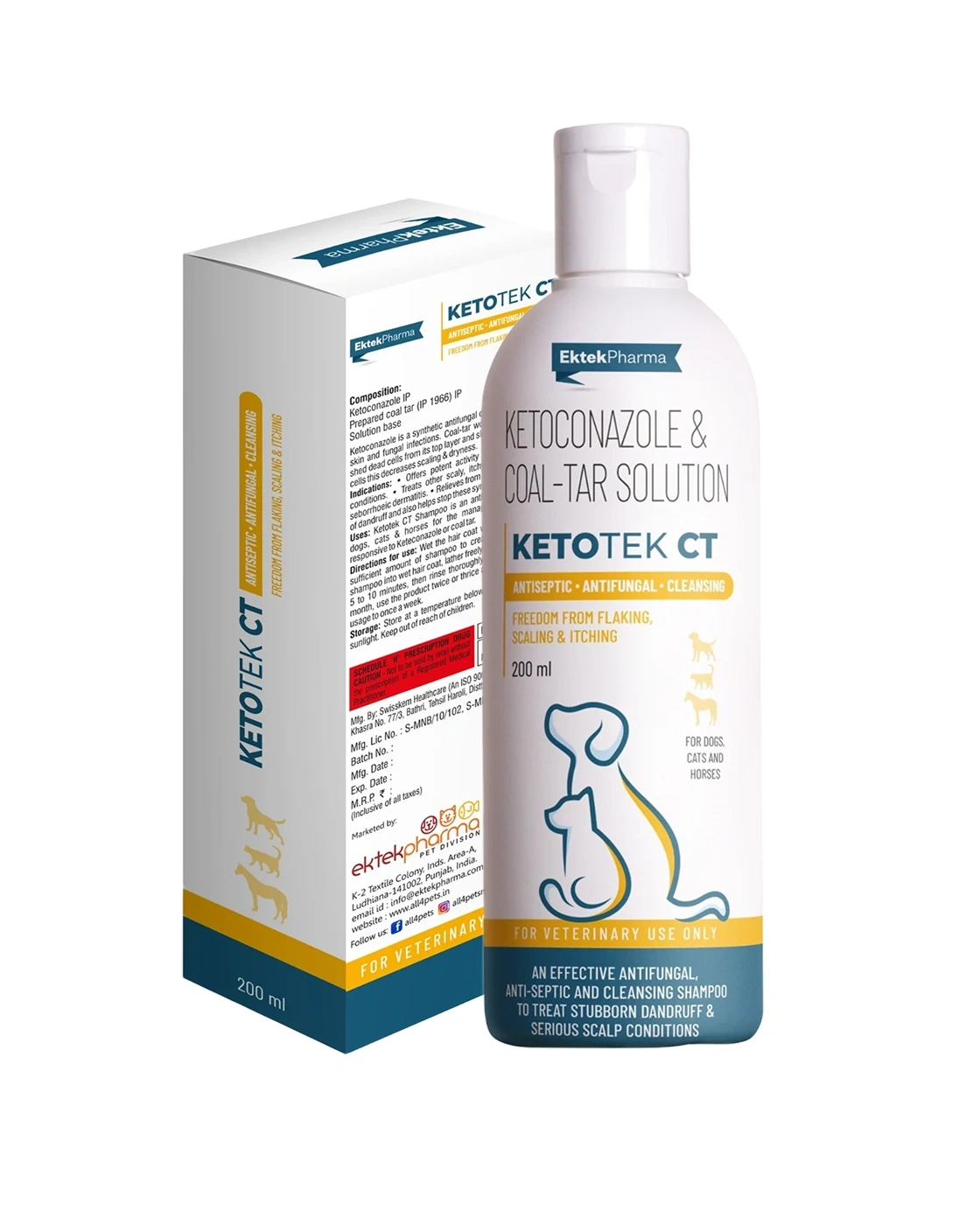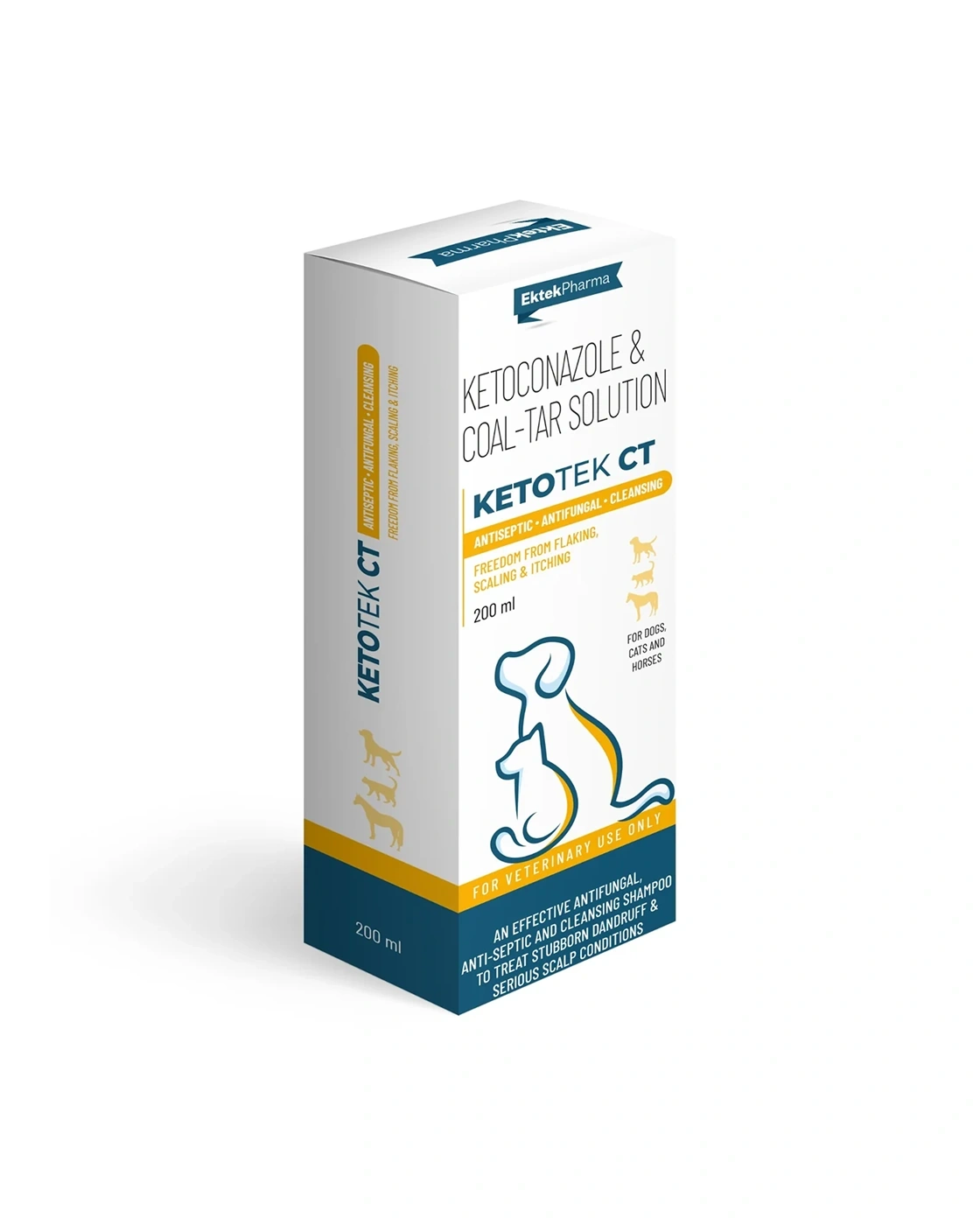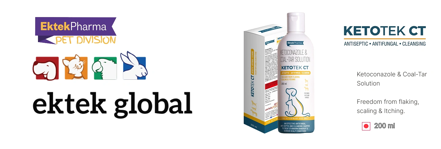 Ketotek CT Shampoo is a powerful antiseptic, antifungal, and cleansing shampoo formulated with Ketoconazole IP 2% w/v and Prepared Coal Tar IP 2% w/v. Designed to treat stubborn dandruff, scaling, flaking, and serious scalp conditions in dogs, cats, and horses, it effectively relieves annoying itching and helps prevent recurrence. This medicated shampoo targets seborrhoeic dermatitis and other conditions responsive to ketoconazole or coal tar, leaving your pet’s coat clean, soothed, and healthy.