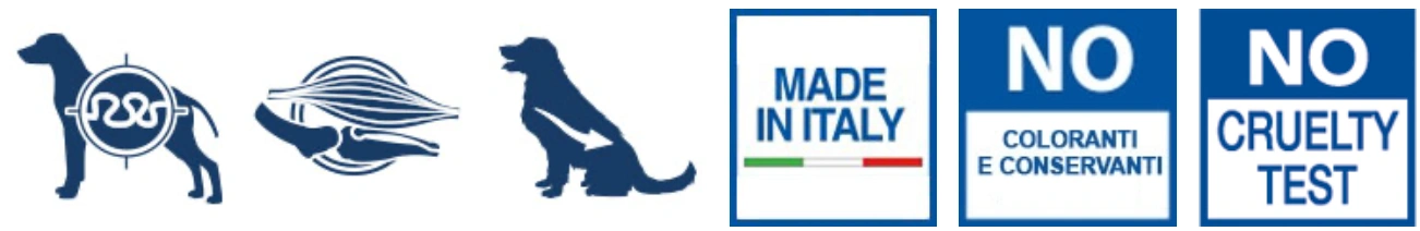 Chicken (dried 30%, fresh meat 10%), rice, animal fat (chicken oil purified at 99.5%), dried beet pulp, hydrolysed animal proteins (liver), maize, brewers’ yeast inactivated, oats, dried eggs, fish (dried salmon), fish oil (salmon oil), minerals, yeasts products (mannan-oligosaccharides MOS 1%), xylo-oligosaccharide (XOS 0.3%), yucca schidigera (0.3%), algae meal (spirulina – Arthrospira platensis 0.3%), glucosamine (0.057%), chondroitin sulphate (0.04%).