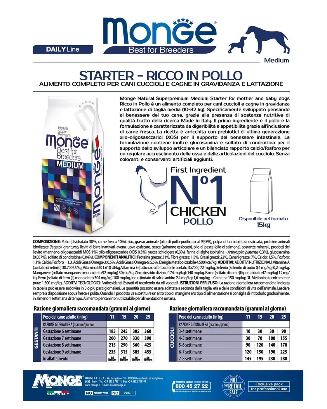 Monge Natural Superpremium Medium Starter for mother and baby dogs Rich in Chicken is a complete pet food for medium‑size puppies (10‑32 kg) and pregnant and lactating bitches. Specially developed for your dog’s wellness through the use of top‑quality nutrients as a result of Made in Italy research. The first ingredient is chicken, and the formulation is characterised by its digestibility and palatability due to the inclusion of fresh meat.