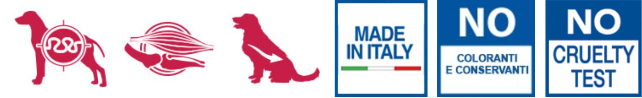 Chicken (dried 30%, fresh meat 10%), rice, animal fat (chicken oil purified at 99.5%), dried beet pulp, hydrolysed animal proteins (liver), maize, brewers’ yeast inactivated, oats, dried eggs, fish (dried salmon), fish oil (salmon oil), minerals, yeasts products (mannan-oligosaccharides MOS 1%), xylo-oligosaccharide (XOS 0.3%), yucca schidigera (0.3%), algae meal (spirulina – Arthrospira platensis 0.3%), glucosamine (0.057%), chondroitin sulphate (0.04%).