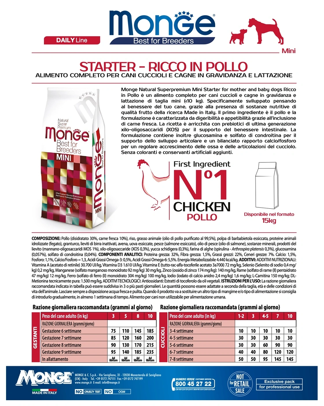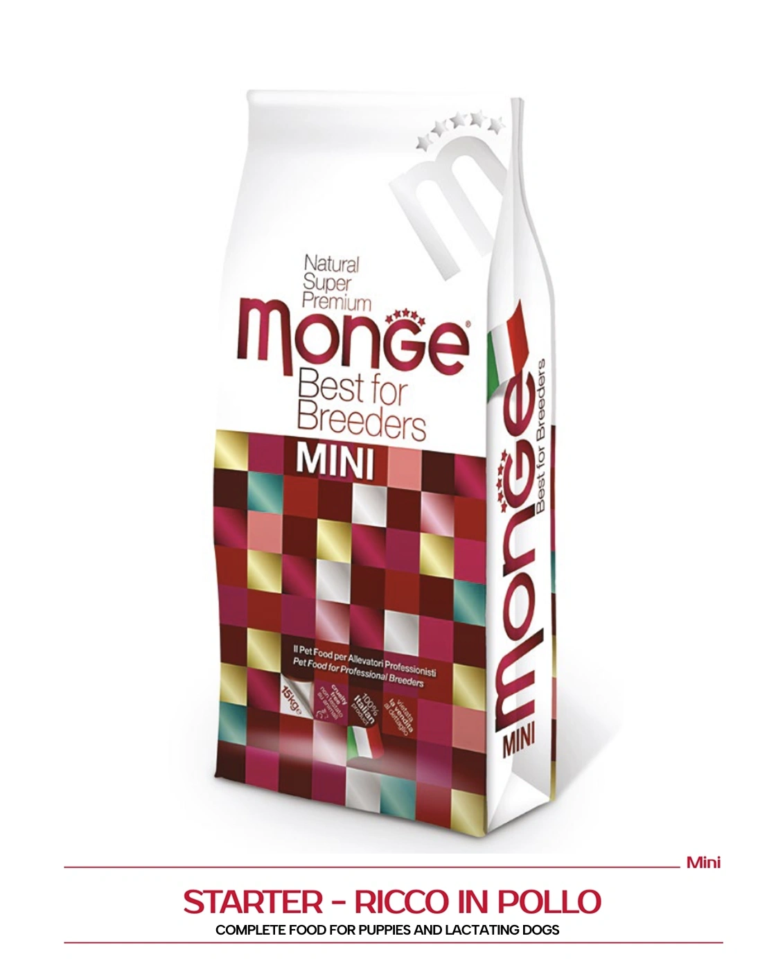 Monge Natural Superpremium Mini Starter for mother and baby dogs Rich in Chicken is a complete pet food for mini‑size puppies (<10 kg) and pregnant and lactating bitches. Specially developed for your dog’s wellness through the use of top‑quality nutrients as a result of Made in Italy research. The first ingredient is chicken, and the formulation is characterised by its digestibility and palatability due to the inclusion of fresh meat.