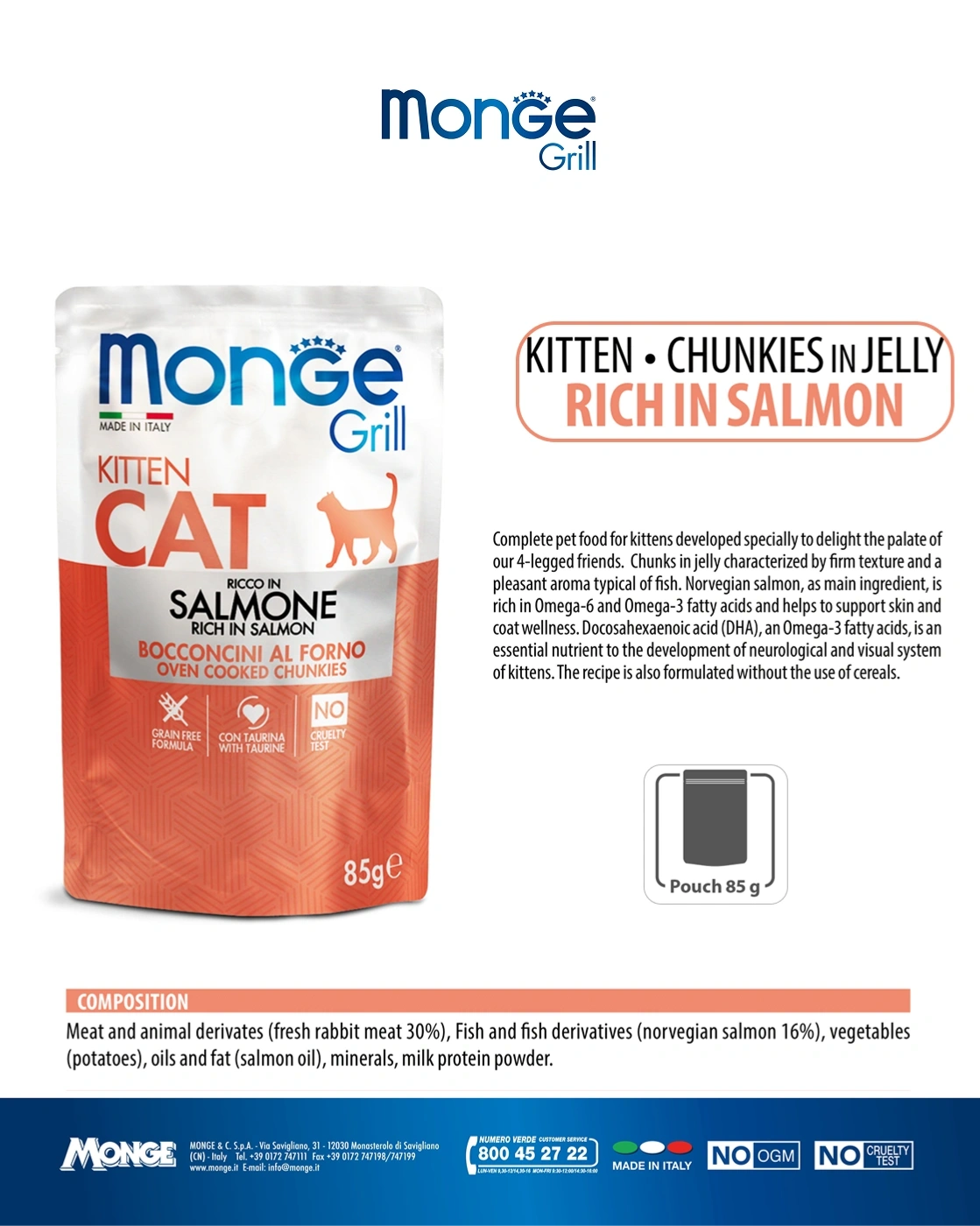 Complete pet food for kittens developed specially to delight the palate of our 4-legged friends. Chunks in jelly characterized by firm texture and a pleasant aroma typical of fish. Norvegian salmon, as main ingredient, is rich in Omega-6 and Omega-3 fatty acids and helps to support skin and coat wellness. Docosahexaenoic acid (DHA), an Omega-3 fatty acids, is an essential nutrient to the development of neurological and visual system of kittens. The recipe is also formulated without the use of cereals.