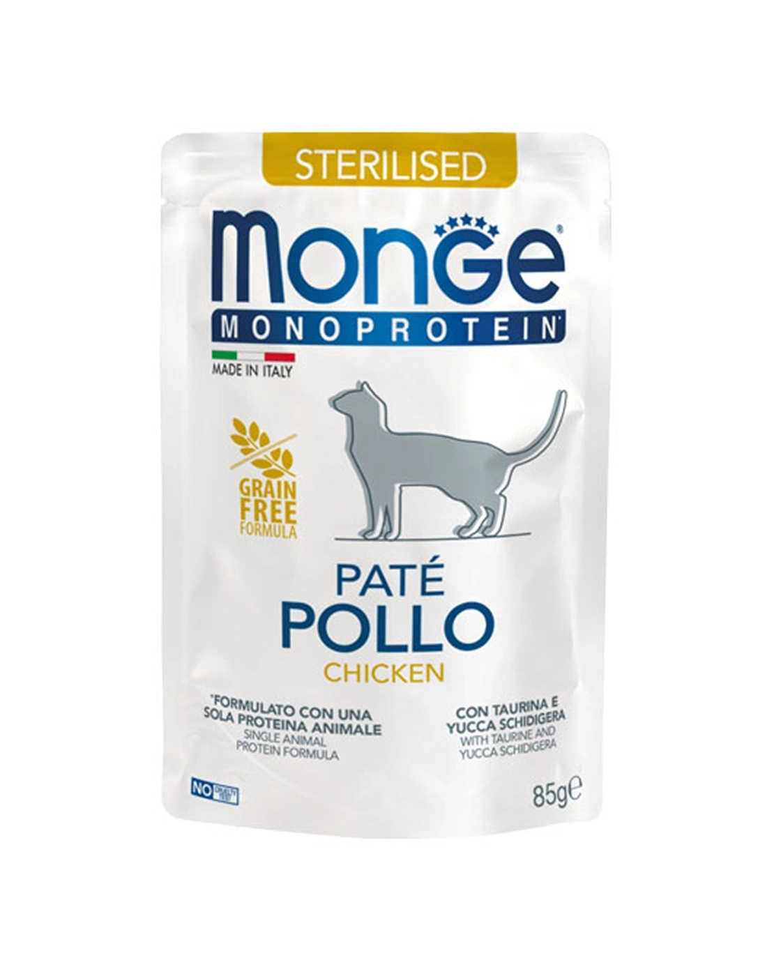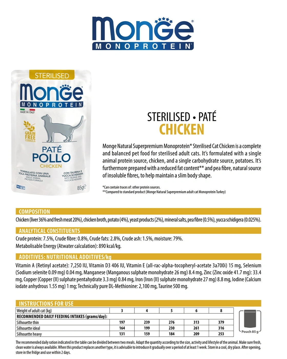 Monge Natural Superpremium Monoprotein* Sterilised Cat Chicken is a complete and balanced pet food for sterilised adult cats. It’s formulated with a single animal protein source, chicken, and a single carbohydrate source, potatoes. It’s furthermore prepared with a reduced fat content** and pea fibre, natural source of insoluble fibres, to help maintain a slim body shape.