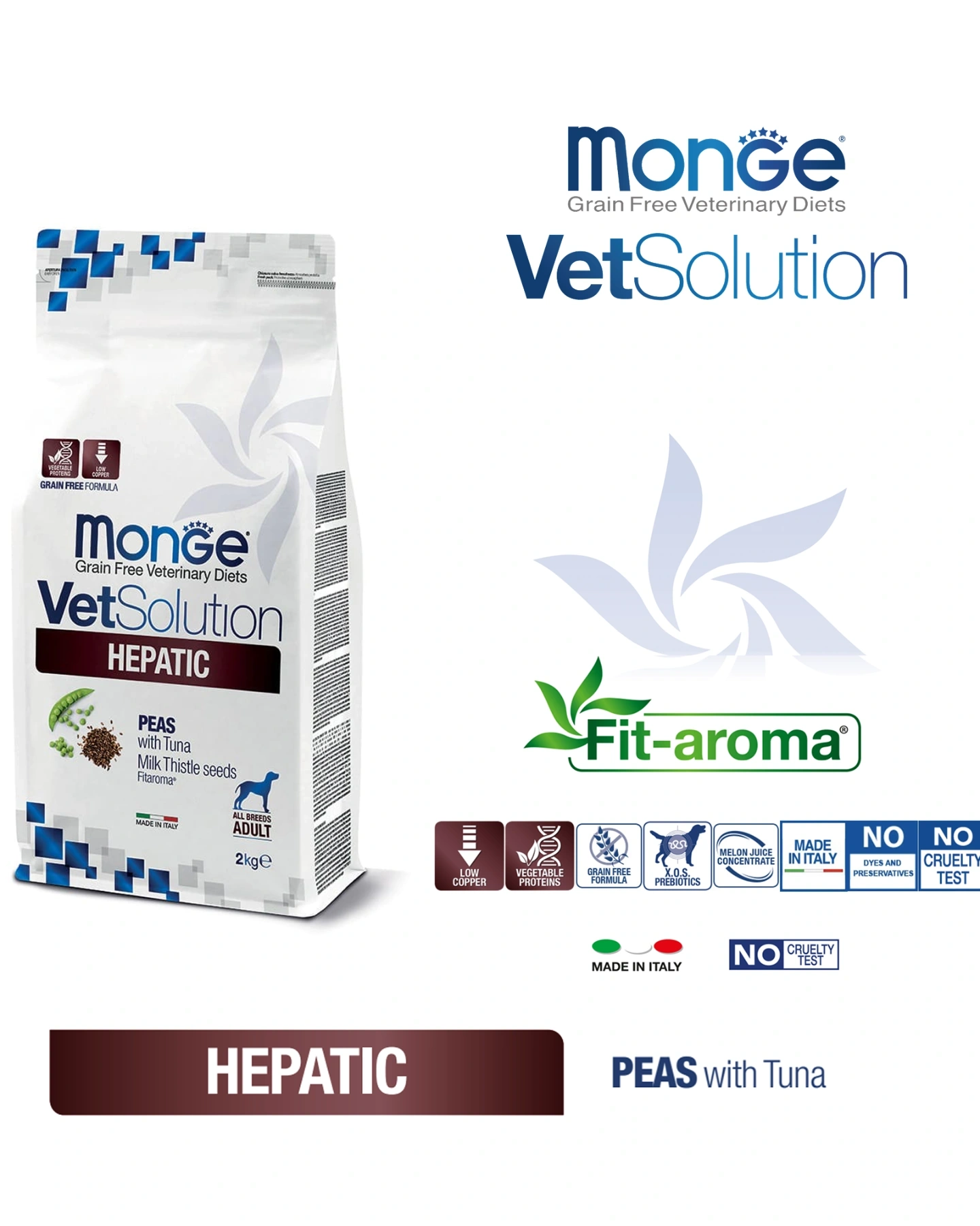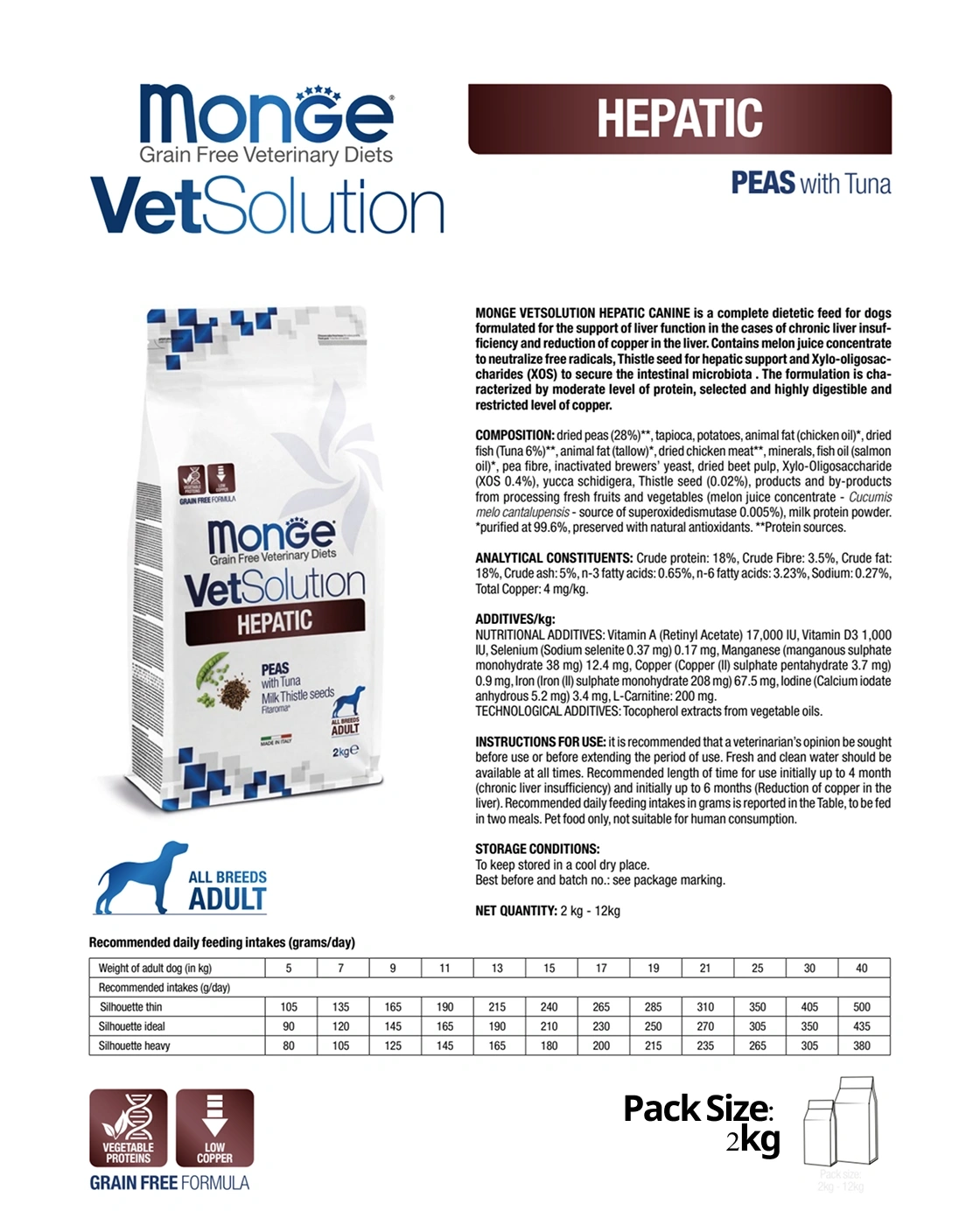 MONGE VETSOLUTION HEPATIC CANINE is a complete dietetic feed for dogs formulated for the support of liver function in the cases of chronic liver insufficiency and reduction of copper in the liver. Contains melon juice concentrate to neutralize free radicals, Thistle seed for hepatic support and Xylo-oligosaccharides (XOS) to secure the intestinal microbiota . The formulation is characterized by moderate level of protein, selected and highly digestible and restricted level of copper.