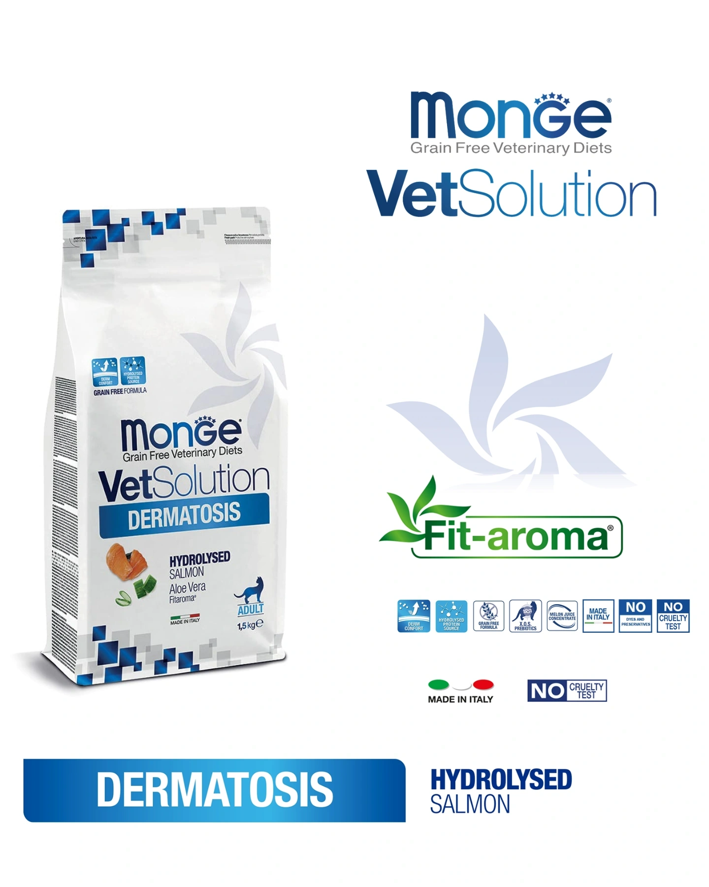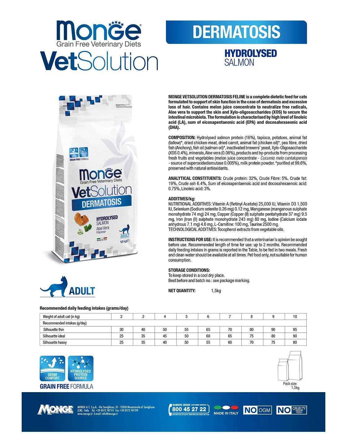Monge VetSolution Dermatosis Feline is a complete dietetic feed for cats formulated to support skin function in cases of dermatosis and excessive hair loss. This scientifically balanced recipe features hydrolysed salmon protein as the primary ingredient and is enriched with high levels of linoleic acid (LA) and omega‑3 fatty acids (EPA and DHA) to help maintain healthy skin and coat. Aloe vera provides soothing support, while Xylo‑oligosaccharides (XOS) promote intestinal wellness, and melon juice concentrate offers natural antioxidant protection.