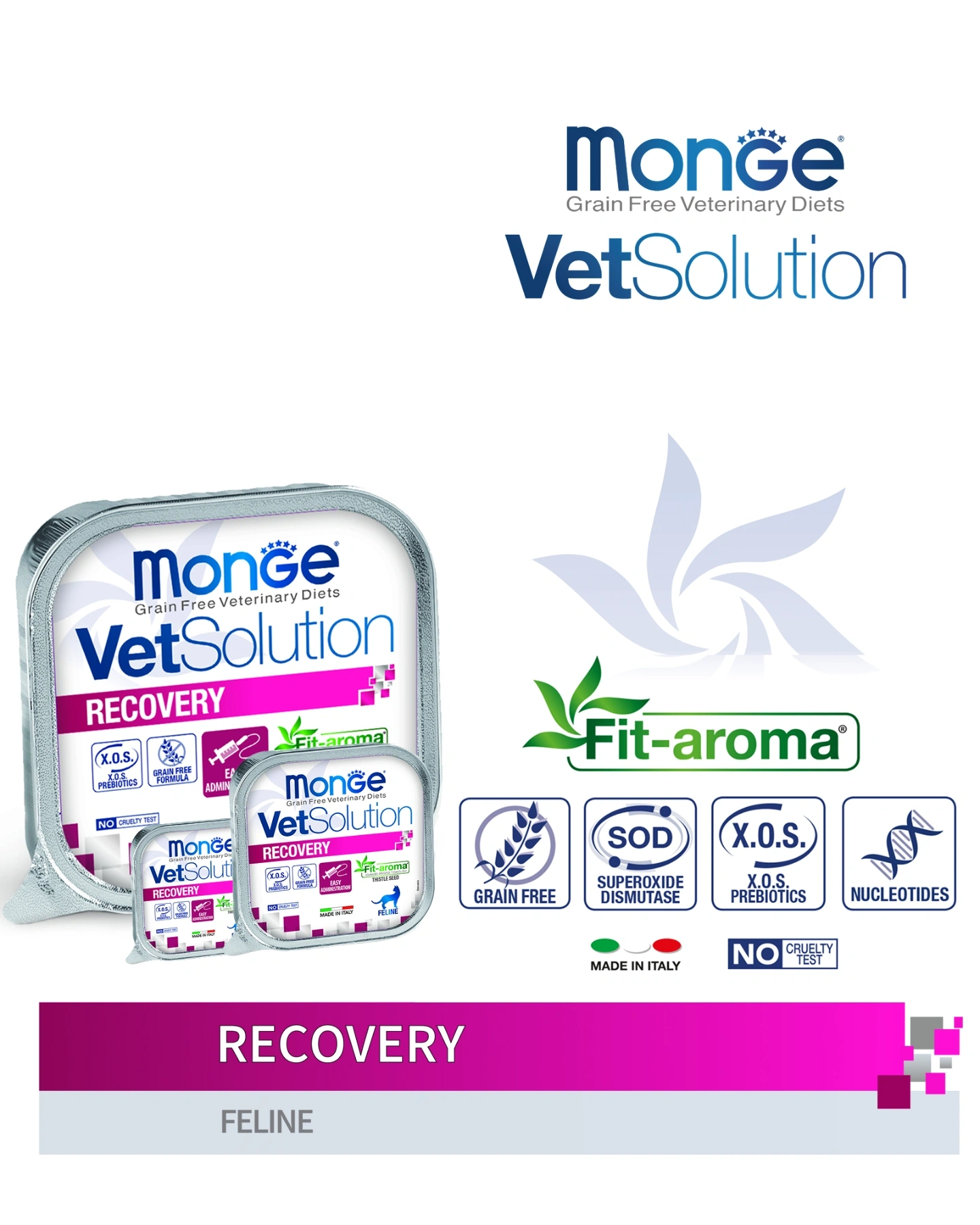 MONGE VETSOLUTION RECOVERY FELINE is a complete dietetic feed for cats formulated for nutritional restoration, convalescence. Contains Nucleotides to support immune system, thisle seed for the support of convalescence, Xylo-oligosaccharides (XOS) to secure the intestinal microbiota. The formulation is characterized by high energy density, high concentrations of essen tial nutrients and highly digestible ingredients.