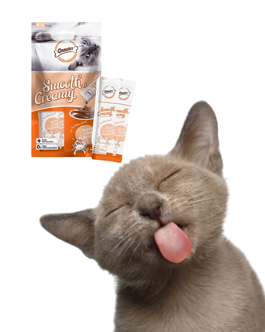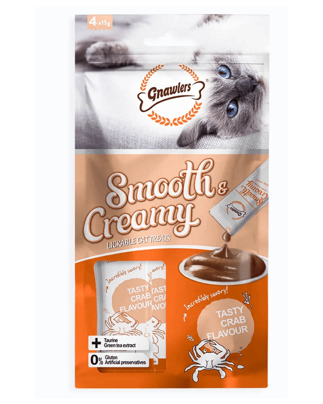 Gnawlers Smooth & Creamy Treats in Crab Flavour are irresistible, ready‑to‑eat lickable treats designed for cats of all breeds aged above 6 months. Featuring a smooth, creamy mousse texture, these complementary snacks are crafted with real tuna and crab as star ingredients, delivering a delicious seafood taste that cats love. Enriched with taurine to support better eyesight and brain function, high‑quality protein for strong muscles, and omega‑6 fatty acids for healthy skin and coat, they also contain green tea extract to help fight tooth decay and boost digestive health. Free from gluten and artificial preservatives, this recipe offers a wholesome daily indulgence.