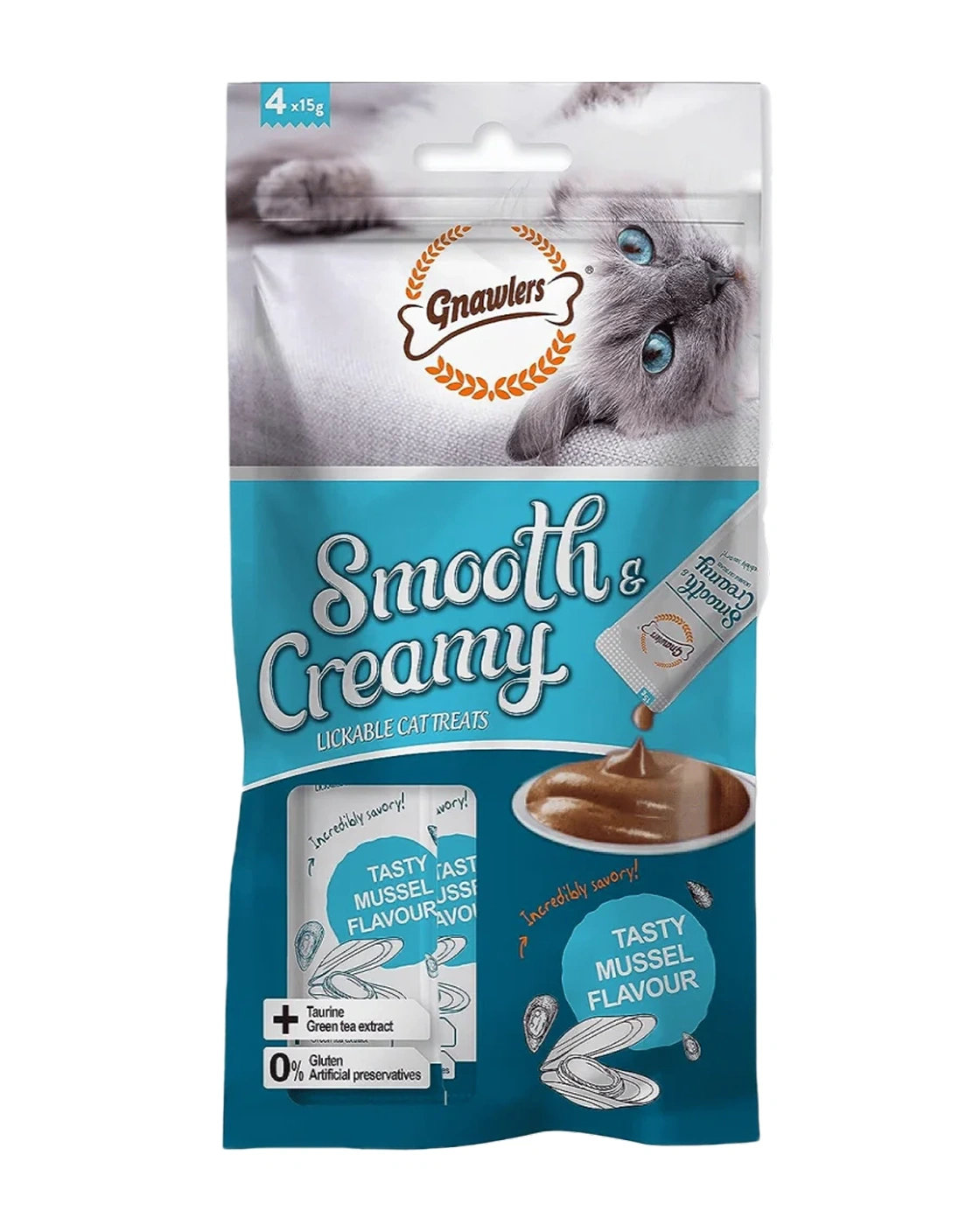 Gnawlers Smooth & Creamy Treats in Mussel Flavour are delicious, ready‑to‑eat lickable treats designed for adult cats aged above 6 months. Featuring a smooth, creamy mousse texture, these treats are crafted with real mussel and tuna, delivering a savory seafood taste that even picky eaters love. Enriched with taurine to support heart and vision health, and green tea extract to aid digestion and dental hygiene, they provide high‑quality protein for strong muscles and a healthy coat. Free from gluten and artificial preservatives, this recipe offers a wholesome daily indulgence.
