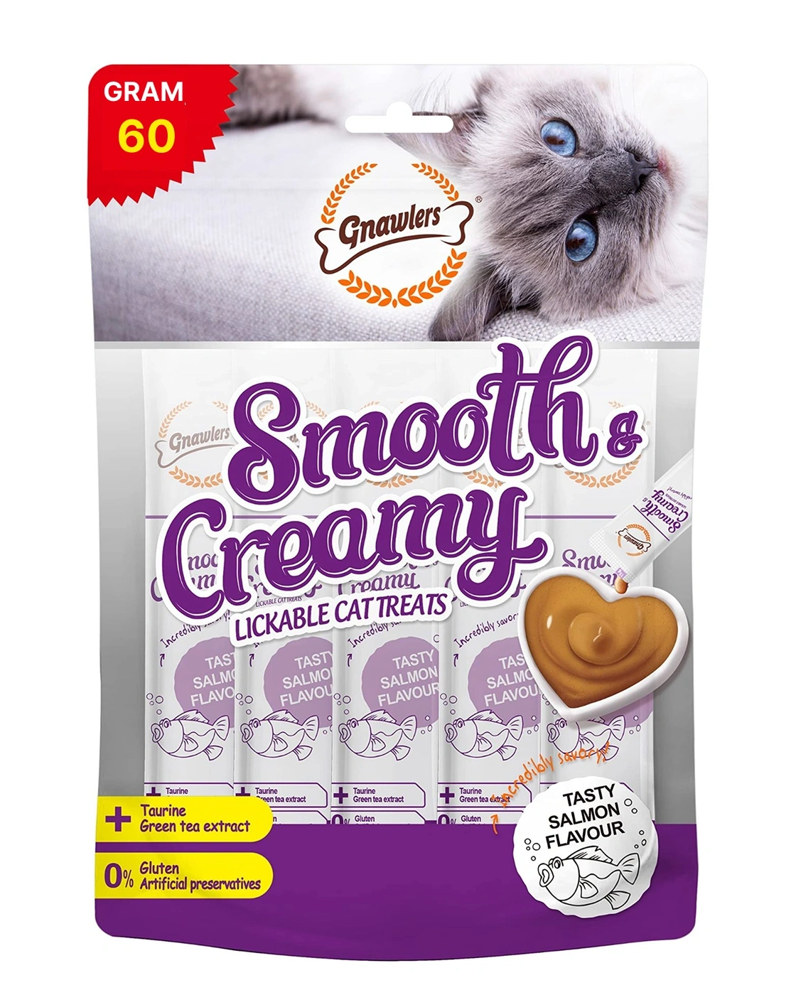 Gnawlers Smooth & Creamy Treats in Salmon Flavour are irresistible, ready‑to‑eat lickable treats designed for cats of all breeds aged above 6 months. Featuring a smooth, creamy mousse texture, these treats are crafted with high‑quality salmon, delivering a delicious seafood taste that cats love. Enriched with taurine to support eye health and brain development, and green tea extract to boost the immune system and help prevent cavities, they also provide high moisture content to help keep your cat hydrated. Free from gluten and artificial preservatives, this recipe offers a wholesome daily indulgence.
