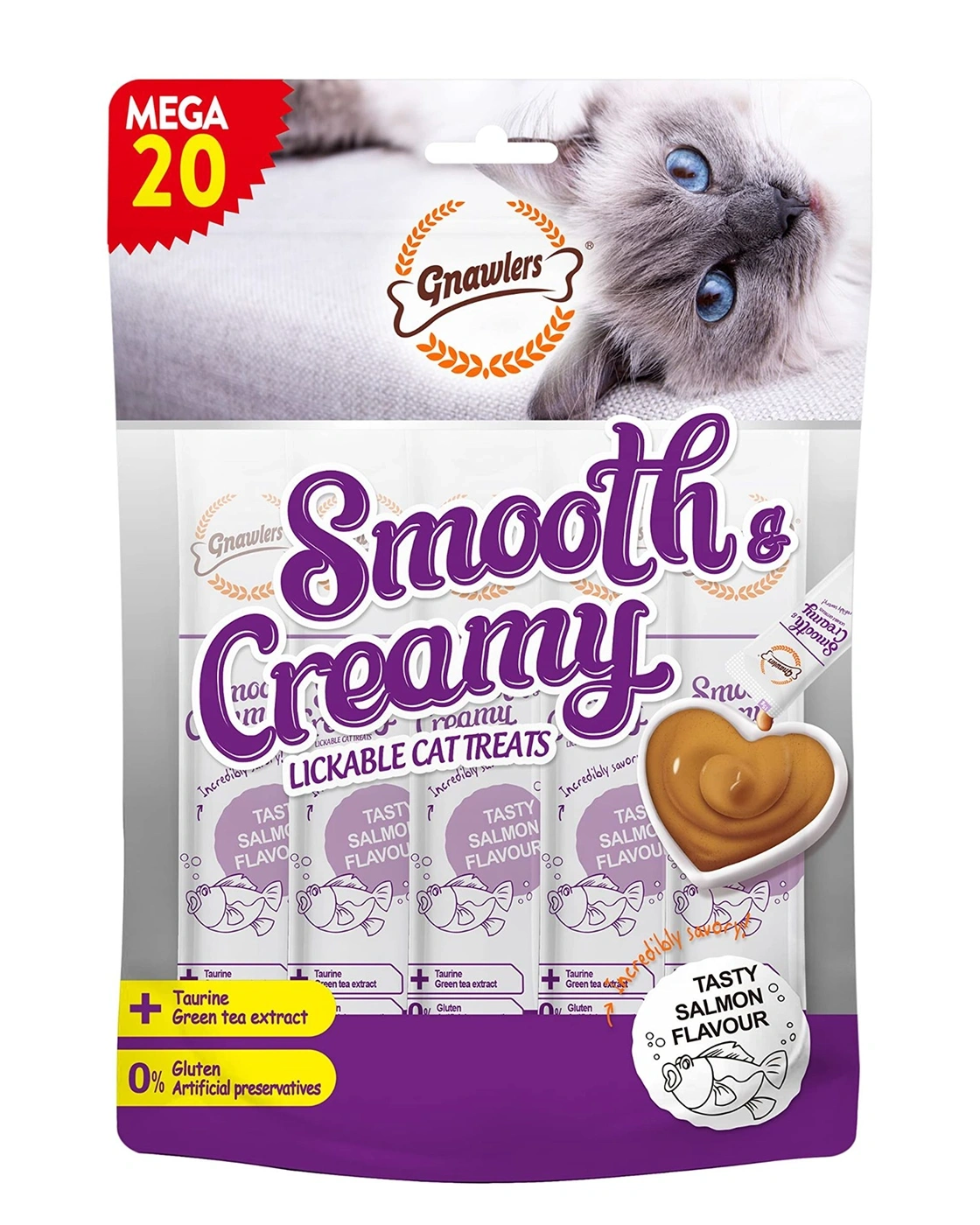 Gnawlers Smooth & Creamy Treats in Salmon Flavour are irresistible, ready‑to‑eat lickable treats designed for cats of all breeds aged above 6 months. Featuring a smooth, creamy mousse texture, these treats are crafted with high‑quality salmon, delivering a delicious seafood taste that cats love. Enriched with taurine to support eye health and brain development, and green tea extract to boost the immune system and help prevent cavities, they also provide high moisture content to help keep your cat hydrated. Free from gluten and artificial preservatives, this recipe offers a wholesome daily indulgence.