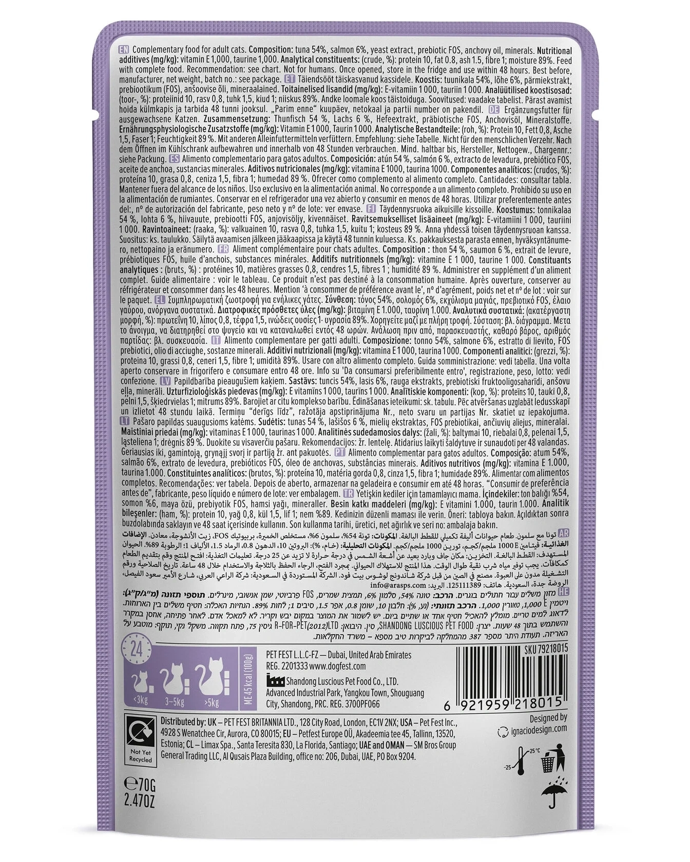 Composition: tuna 54%, salmon 6%, yeast extract, prebiotic FOS, anchovy oil, minerals.